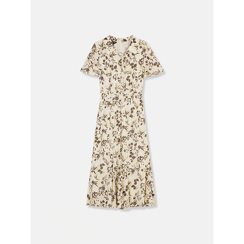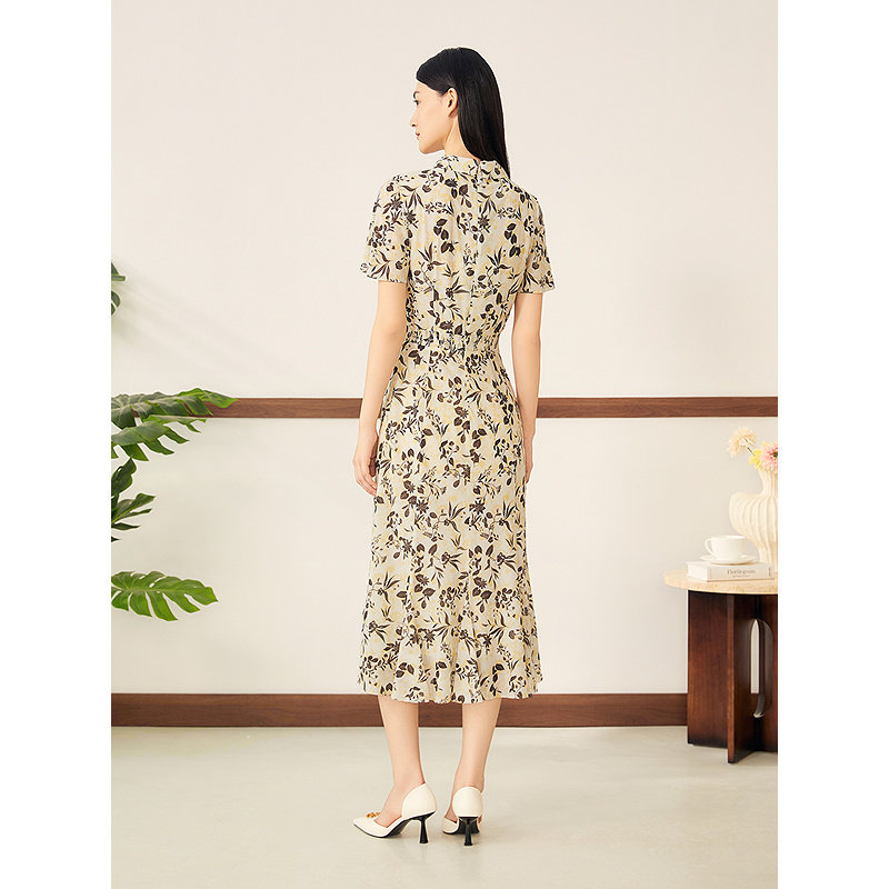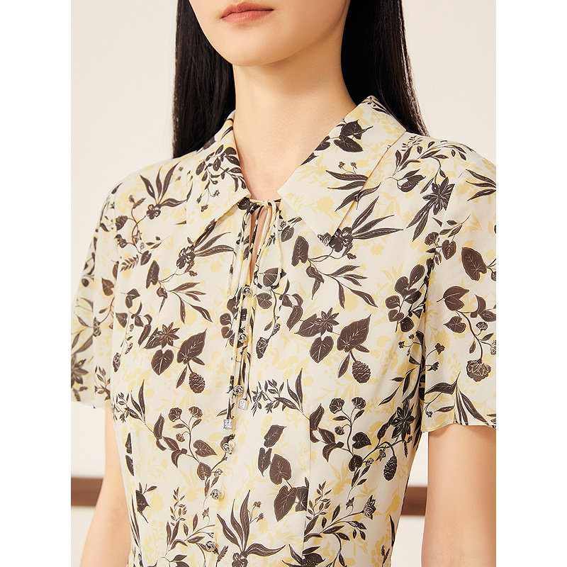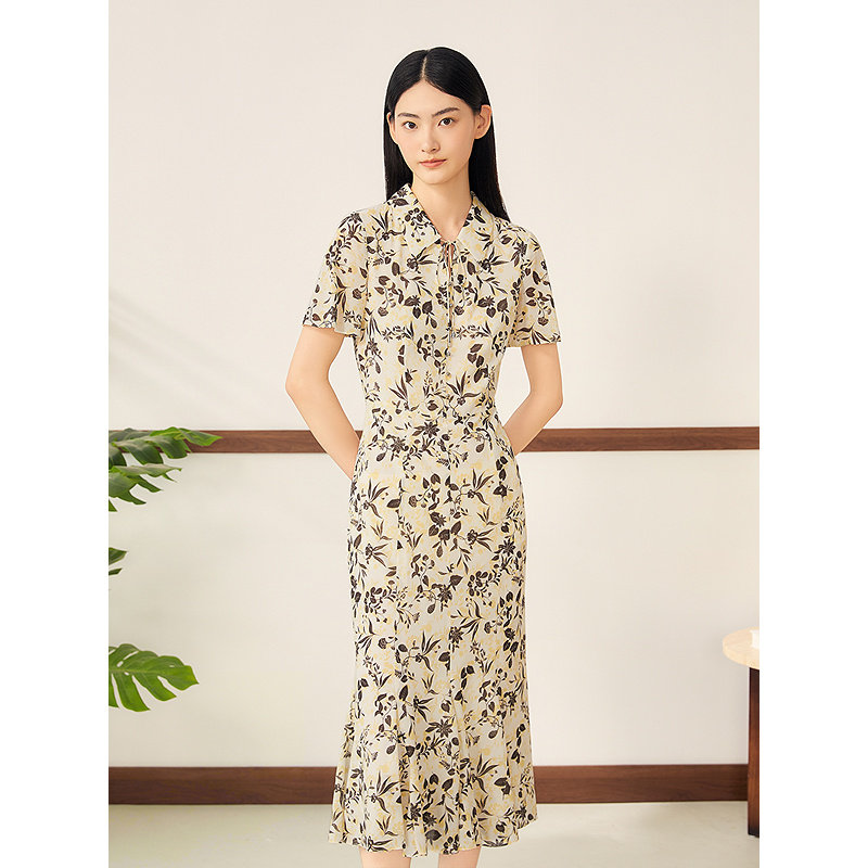 YINER音儿女装2025秋季新款法式桑蚕丝真丝印花衬衫领鱼尾连衣裙