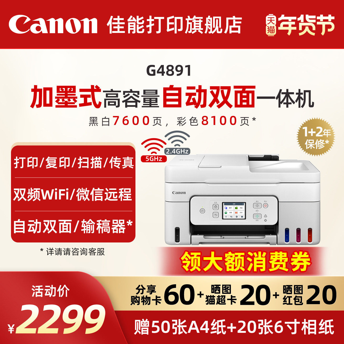 佳能旗舰店G4880/G4881/G4891自动双面一体机原装加墨彩色A4复印扫描传真无线WiFi微信远程打印家用办公