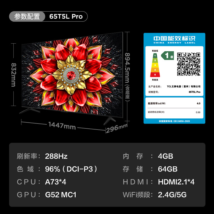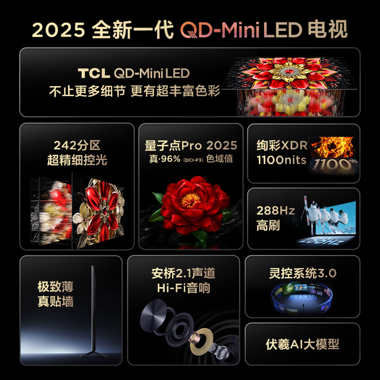 TCL电视 65T5L Pro 65英寸 QD-Mini LED绚彩XDR 1100nits超薄电视