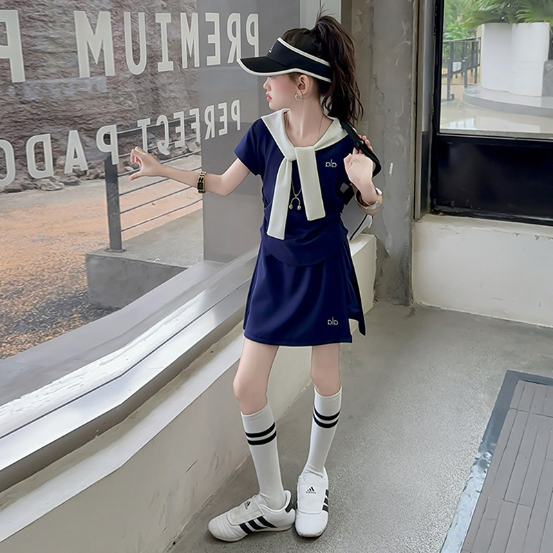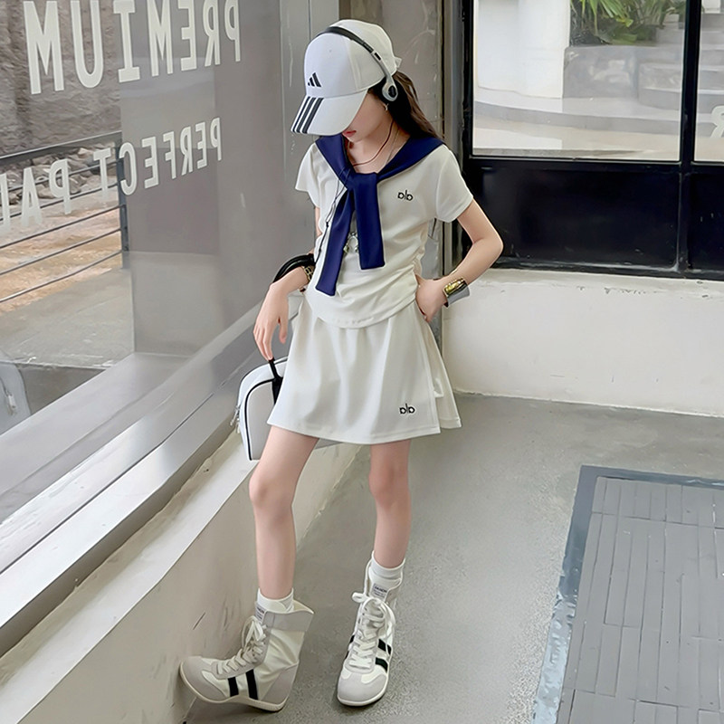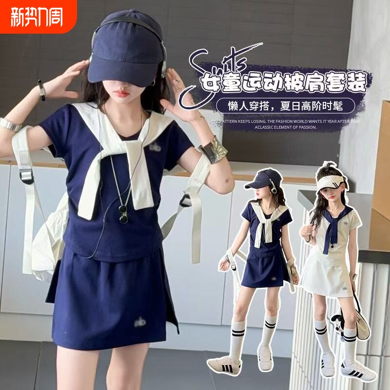 女童休闲短袖短裙套装夏季2026新款披肩收腰T恤裙裤运动两件套潮