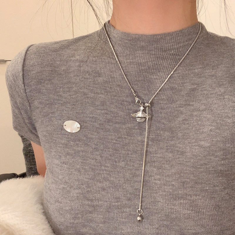韩系银色烟花珍珠流苏项链女轻奢高级感长款颈链可抽拉毛衣链配饰