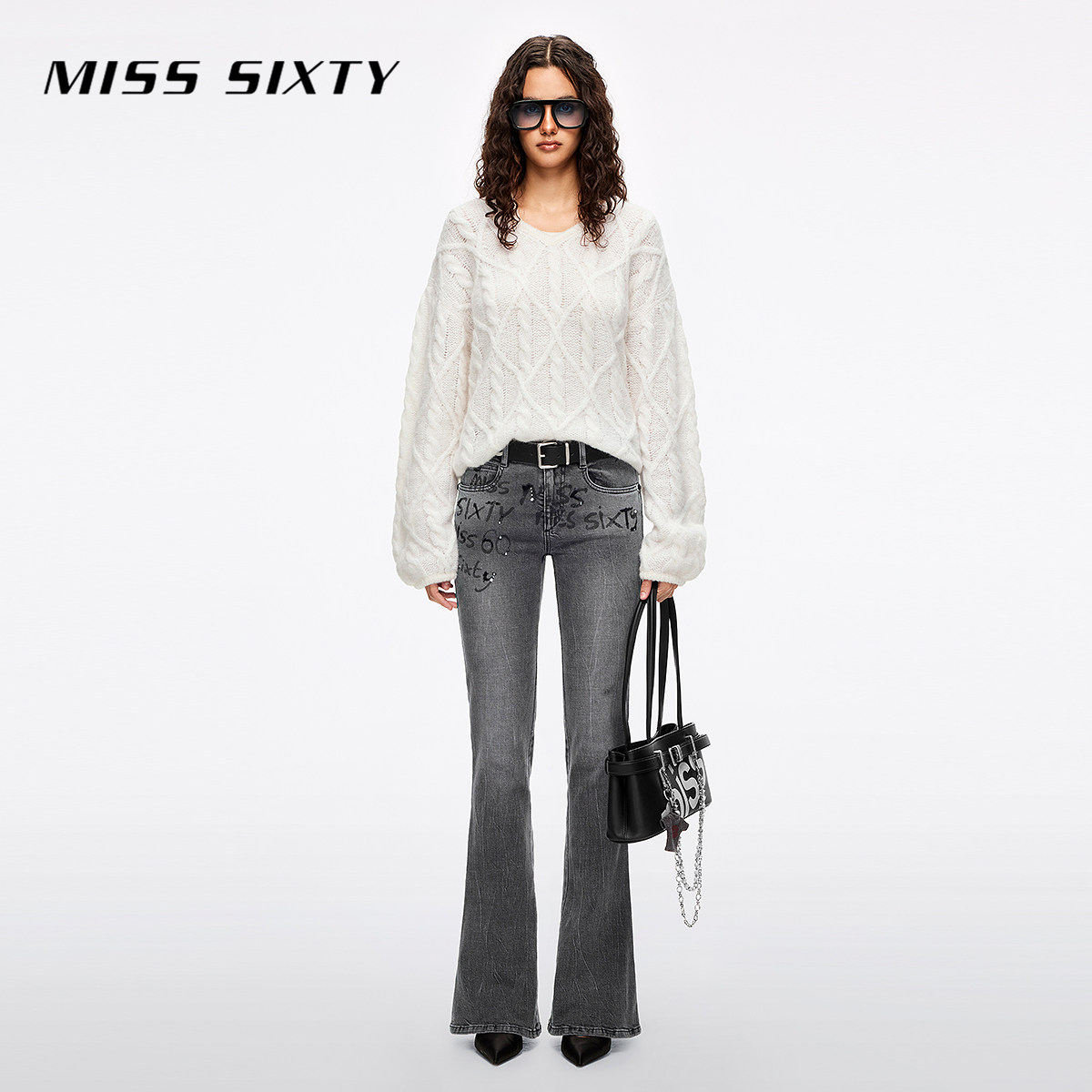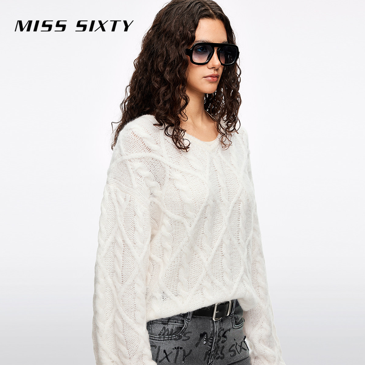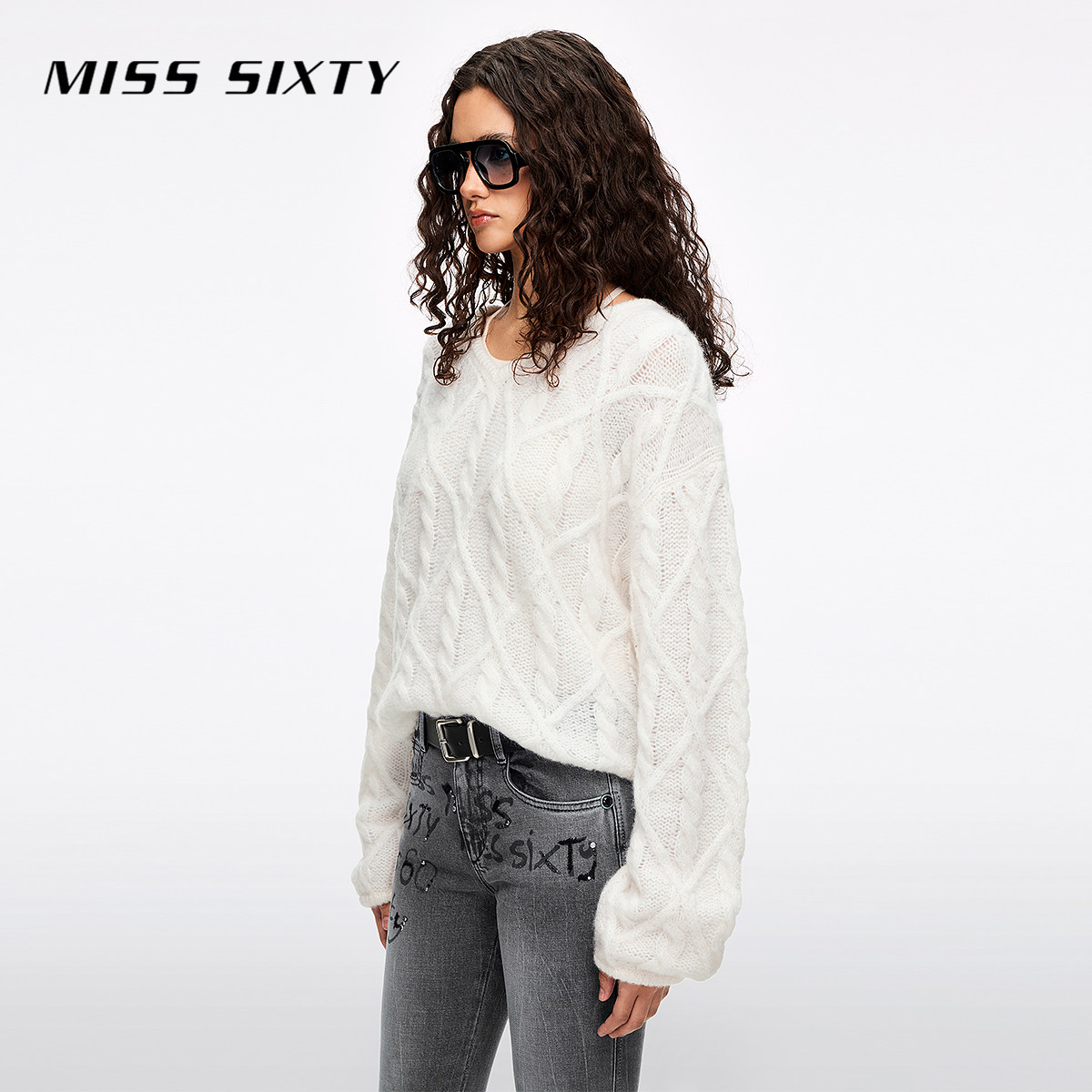 Miss Sixty2025冬季新款马海毛针织衫女V领绞花菱格亮丝毛衣上衣