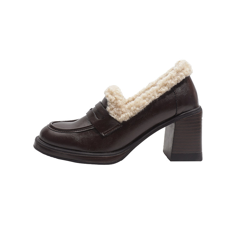 真皮~骄屿复古加绒乐福鞋女粗跟毛毛小皮鞋一脚蹬高跟玛丽珍单鞋