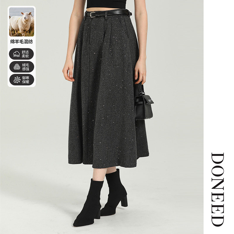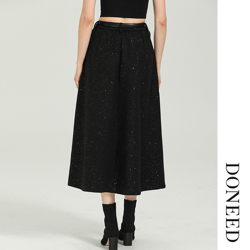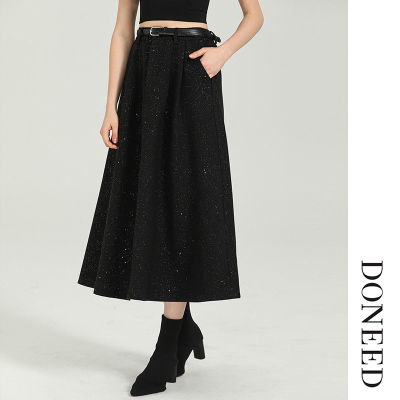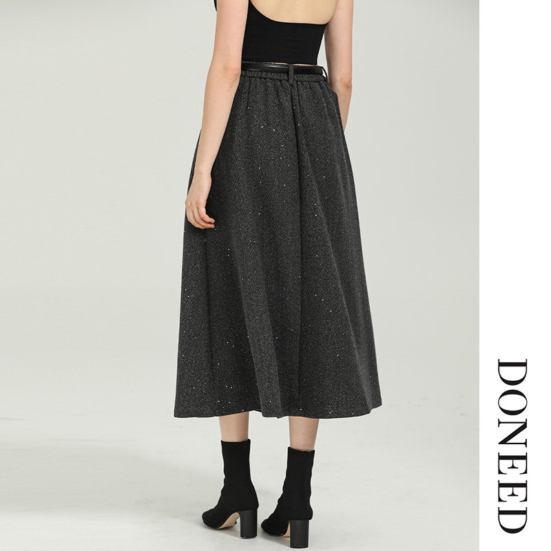 DONEED秋款优雅气质撒银设计感A摆配腰带高腰显瘦纯色半身裙女
