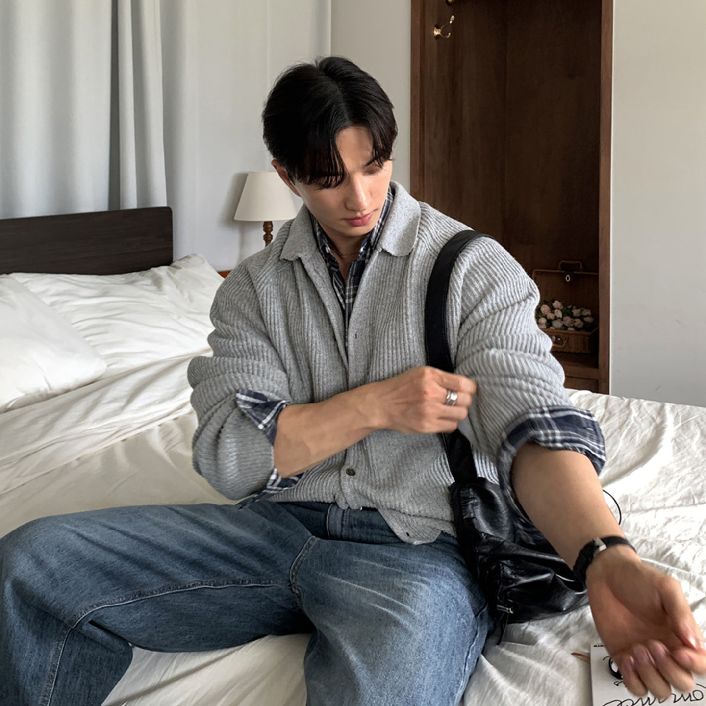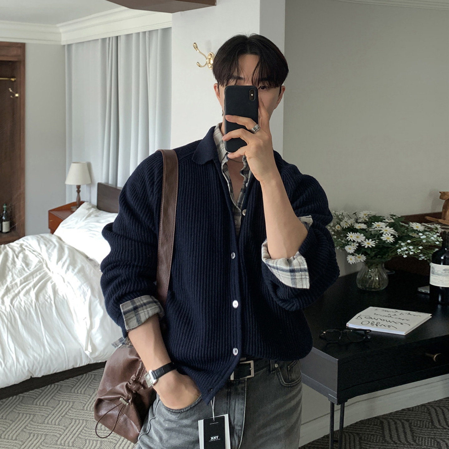 碧舍韩版秋冬新款男士针织衫潮流宽松百搭休闲立体肌理感毛衣外套