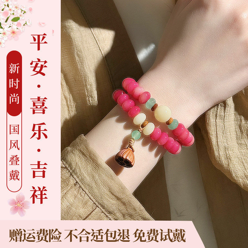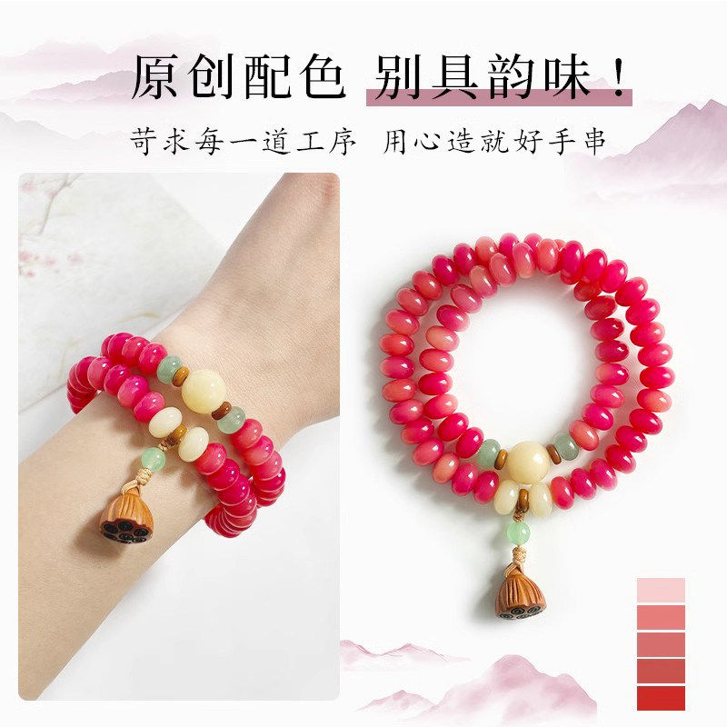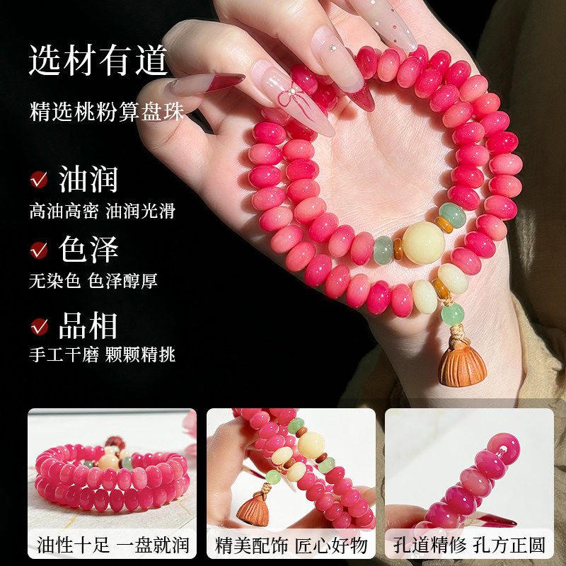 国风桃花粉算盘珠菩提根手串女盘玩招财菩提双圈手持佛珠念珠手链