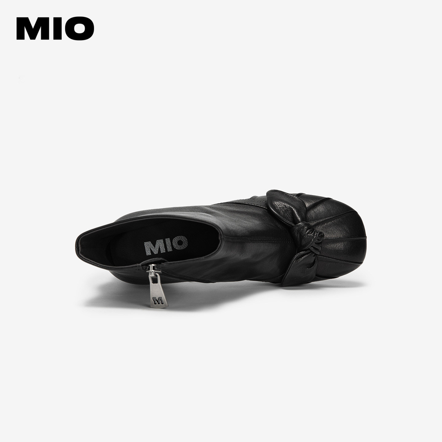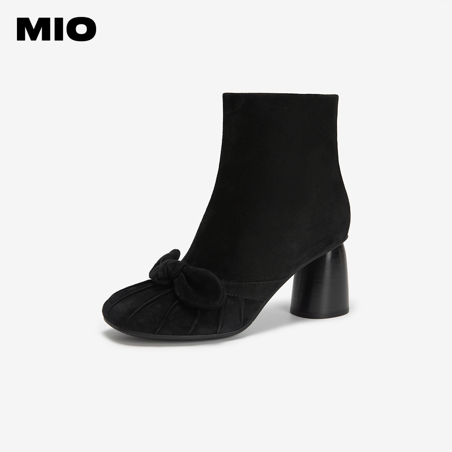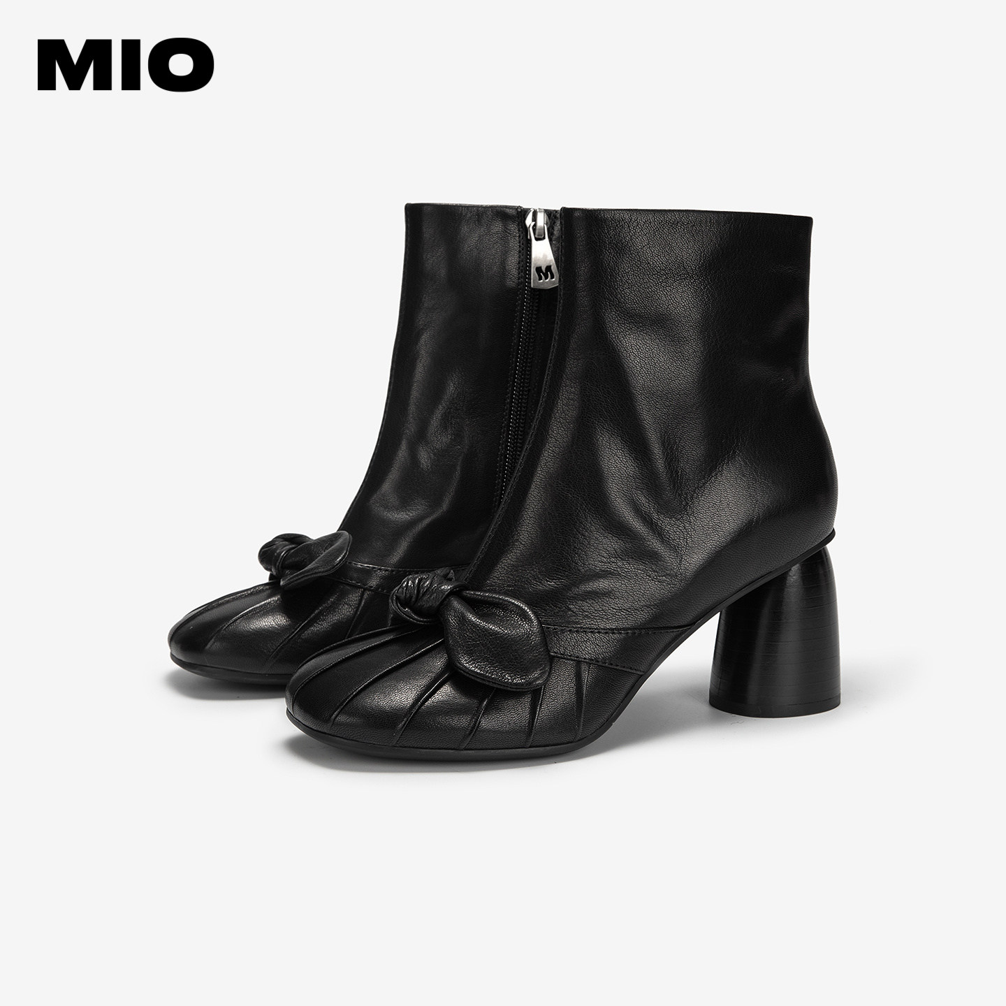 MIO米奥2025冬季新款时装靴圆头高跟短筒靴粗跟黑色增高真皮靴子