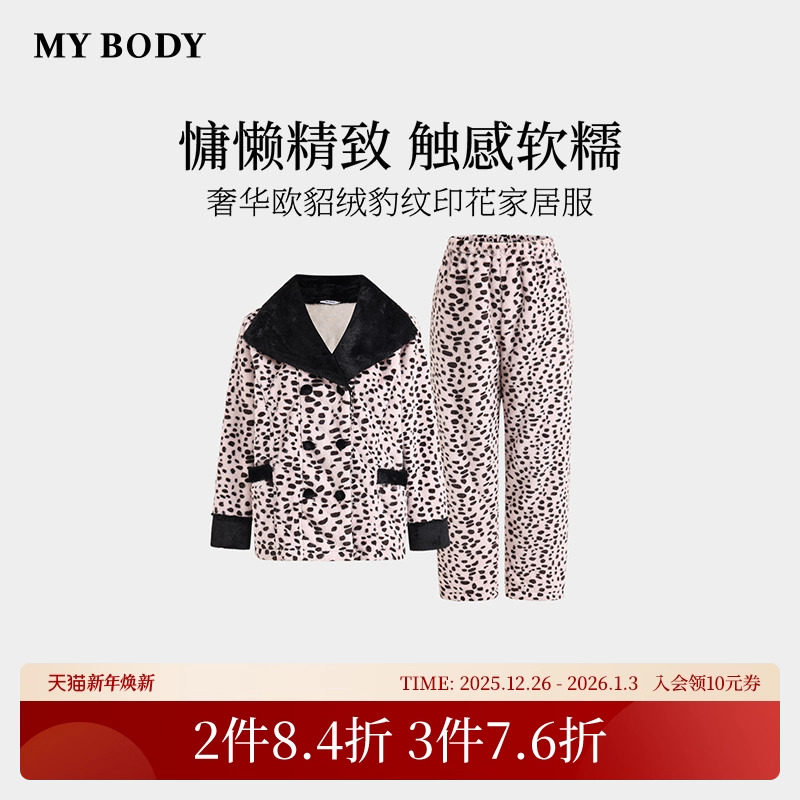 商场同款MYBODY冬季新款睡衣复古双排扣欧貂绒豹纹印花家居服套装