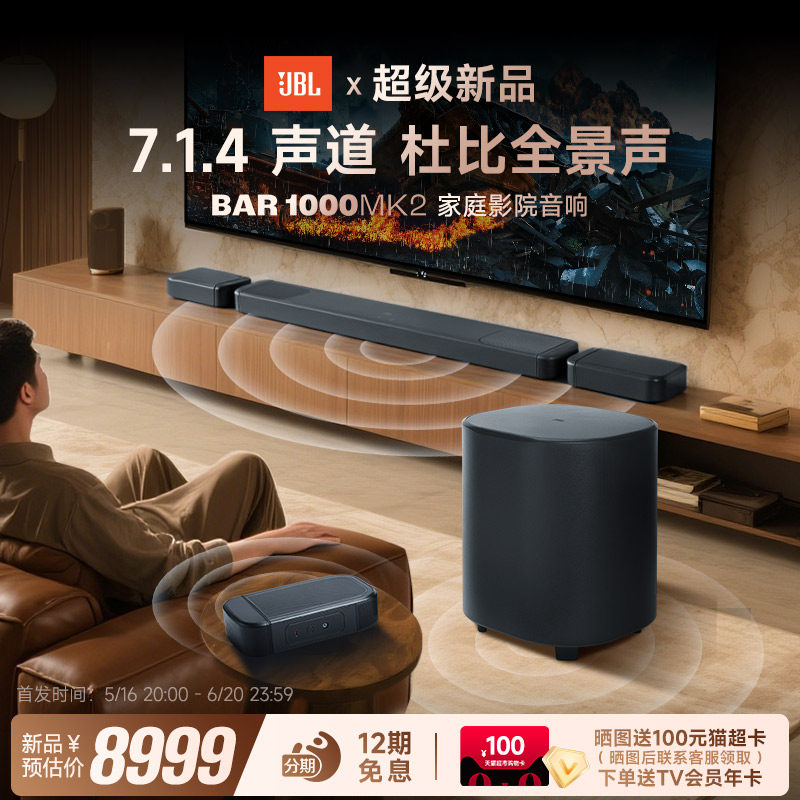 JBL BAR1000MK2家庭影院3D环绕回音壁7.1.4声道低音炮360W