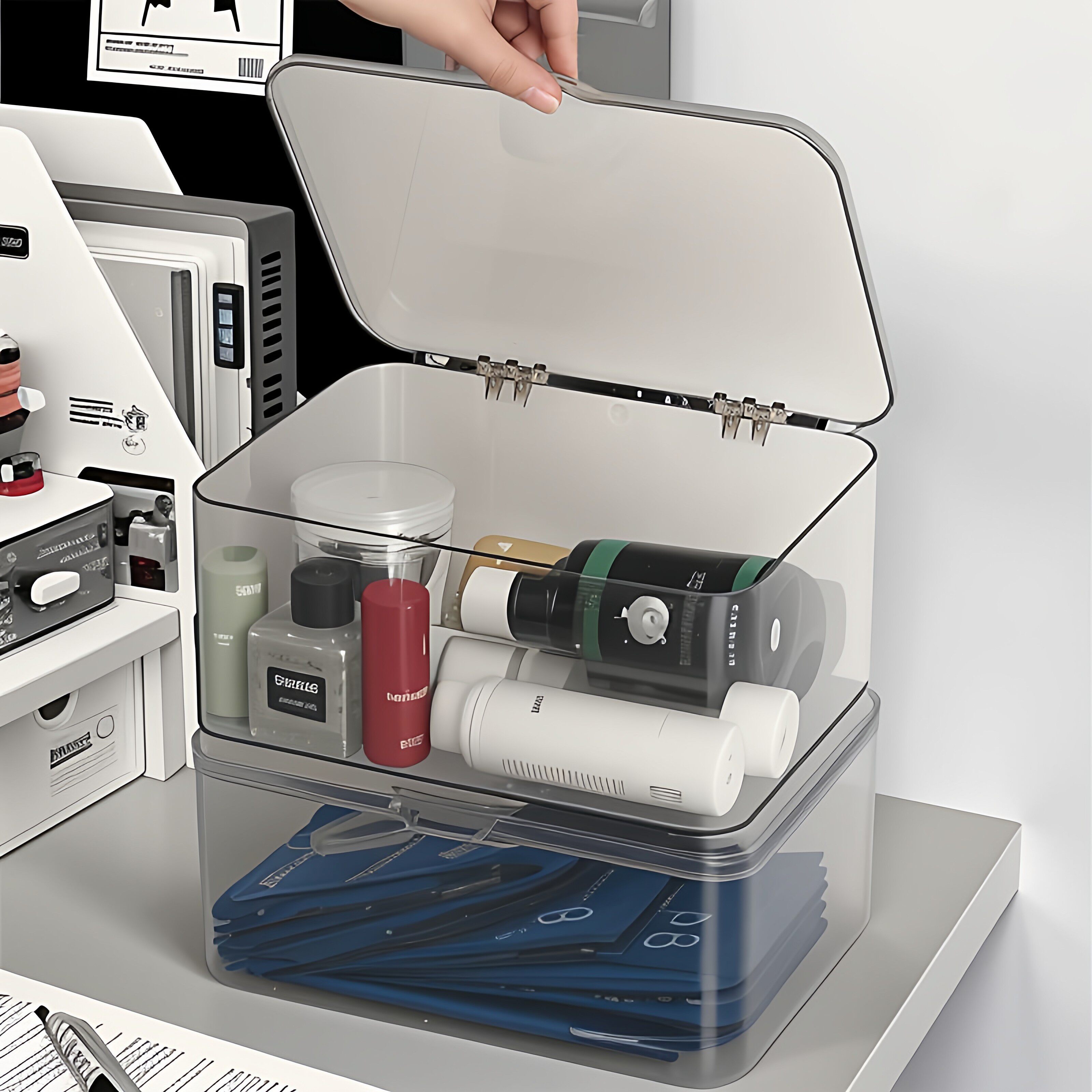 翻盖式桌面收纳盒透明亚克力防尘整理盒卧室宿舍办公室带盖杂物筐