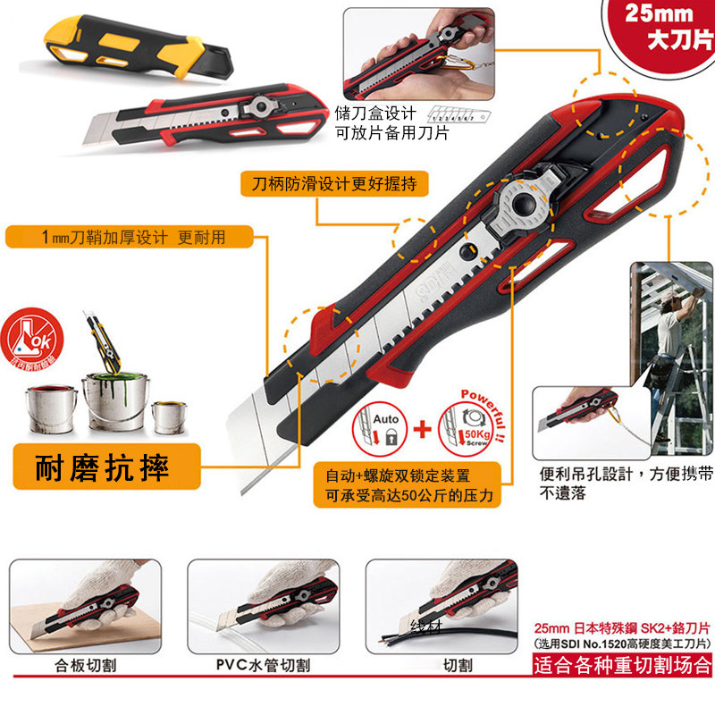 SDI手牌25mm美工刀超大号重型加厚电缆剥皮输送带硅钙板吊顶木板工具刀特大码壁纸刀进口多功能pvc切割刀架