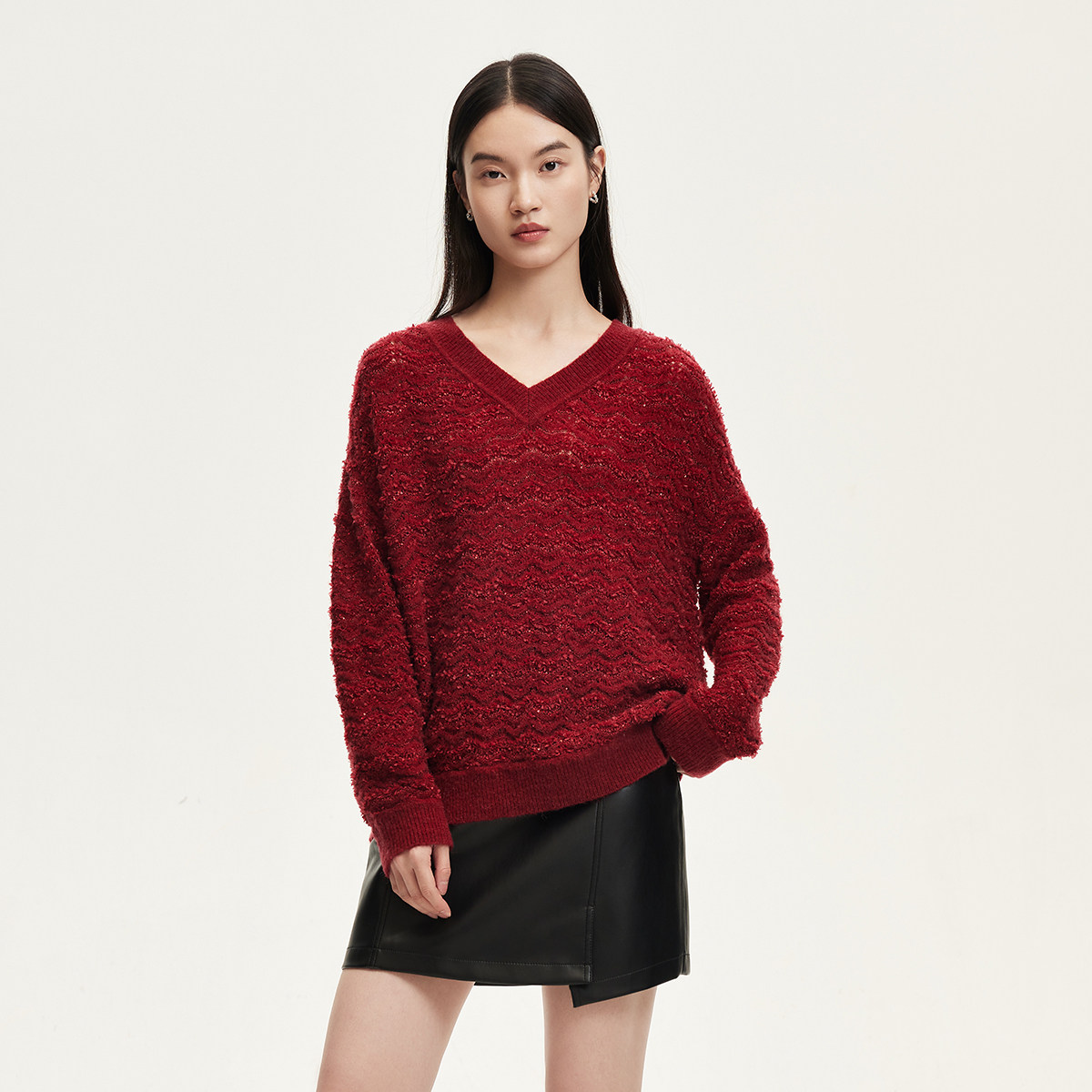 VeroModa针织衫秋冬V领宽松蝙蝠袖羊毛混纺纯色毛衣324413046