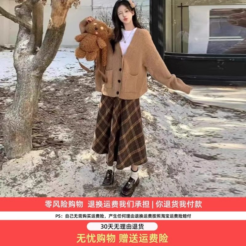 三福半身裙2025新款冬季巨好看的蕾丝拼接复古格子裙子女装509019