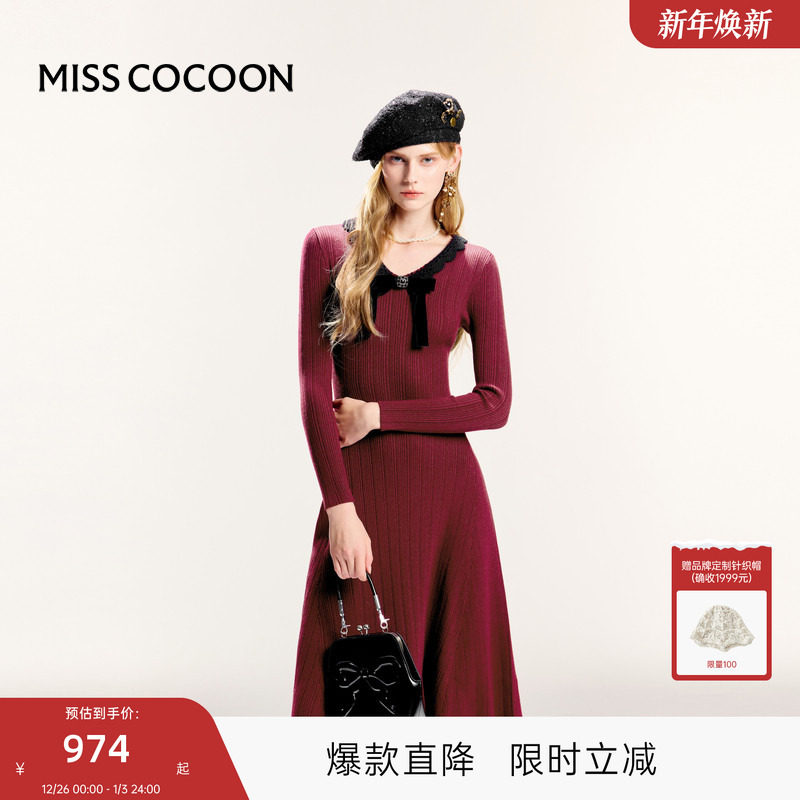 可可尼cocoon2025秋季新款法式小香风红色针织长裙新年穿搭连衣裙