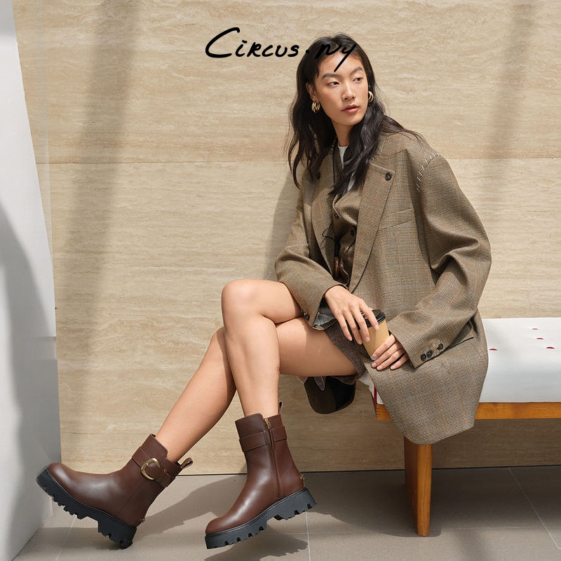 SAM EDELMAN山姆爱德曼冬新皮带扣机车短靴增高厚底女黑棕CIRCUS