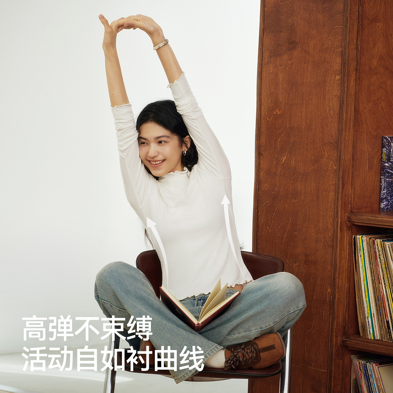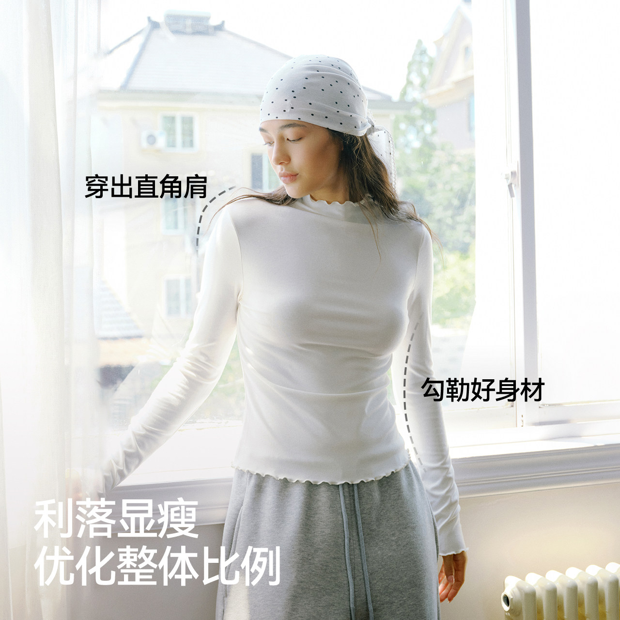 森马长袖T恤女半高领紧身纯色冬季2025新款发热抓绒木耳边打底衫