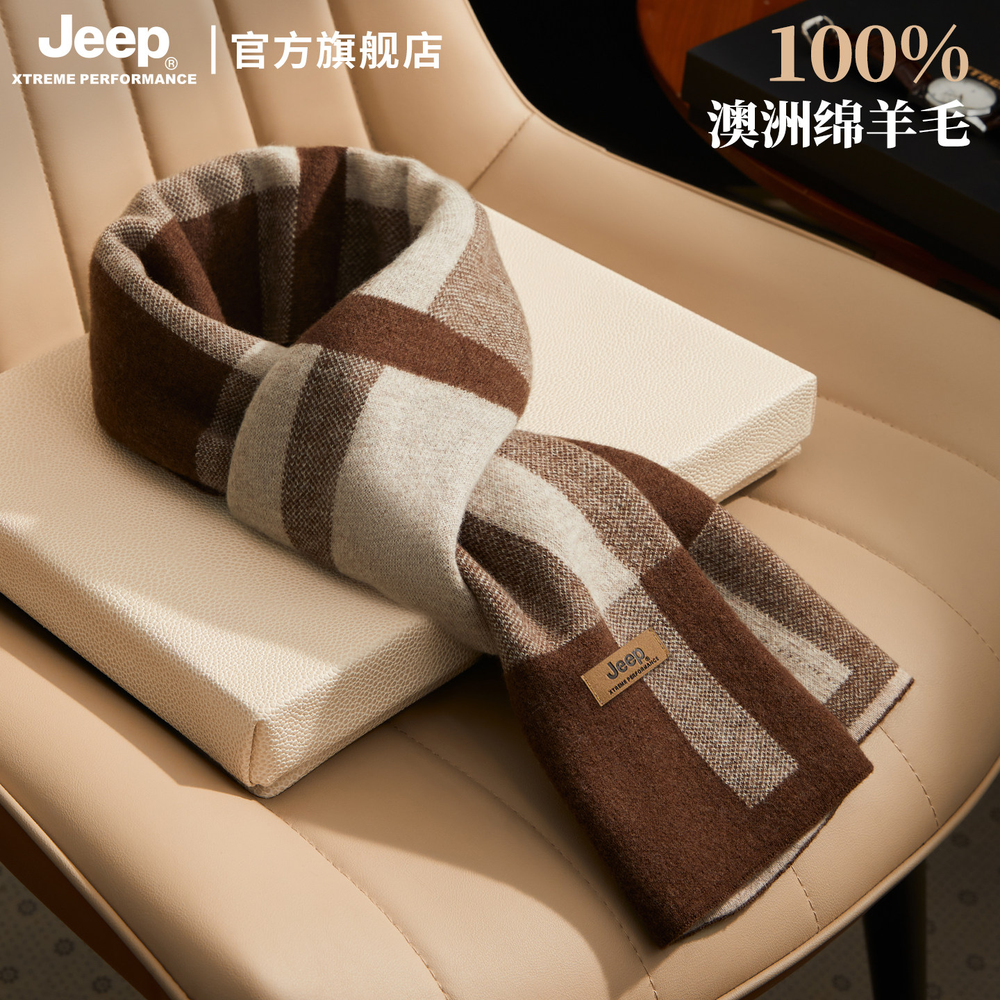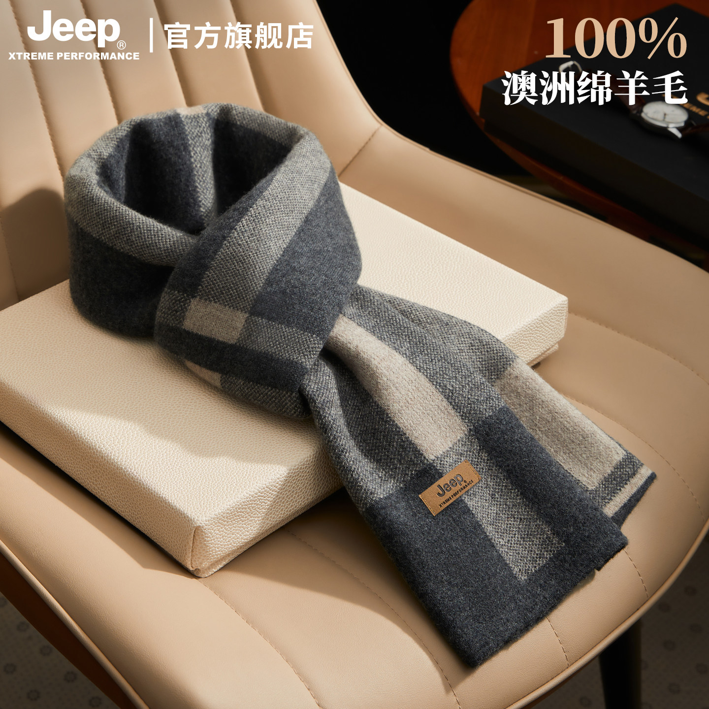 jeep吉普100%羊毛围巾男士冬季保暖加厚围脖礼盒装送男友生日礼物