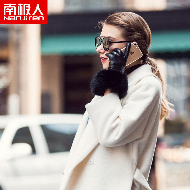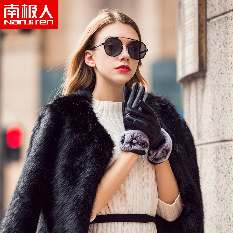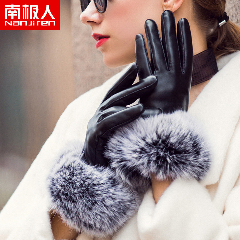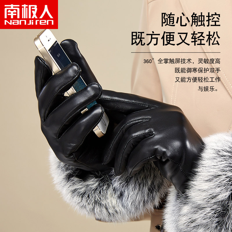 南极人秋季真皮手套冬天女触屏加绒兔毛口羊皮防风保暖骑行开车H