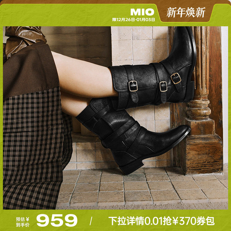 [张钧甯同款]MIO米奥冬中筒靴质感西部骑士靴复古厚底圆头靴子女