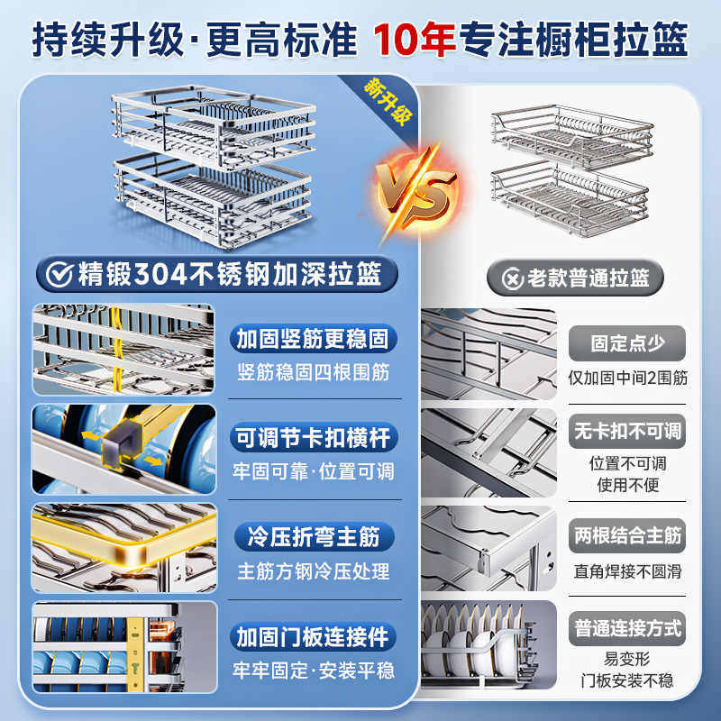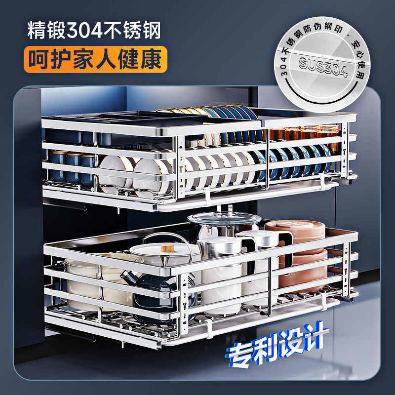 厨房拉篮橱柜304不锈钢双层抽屉式碗架碗碟篮碗柜厨柜碗篮柜收纳