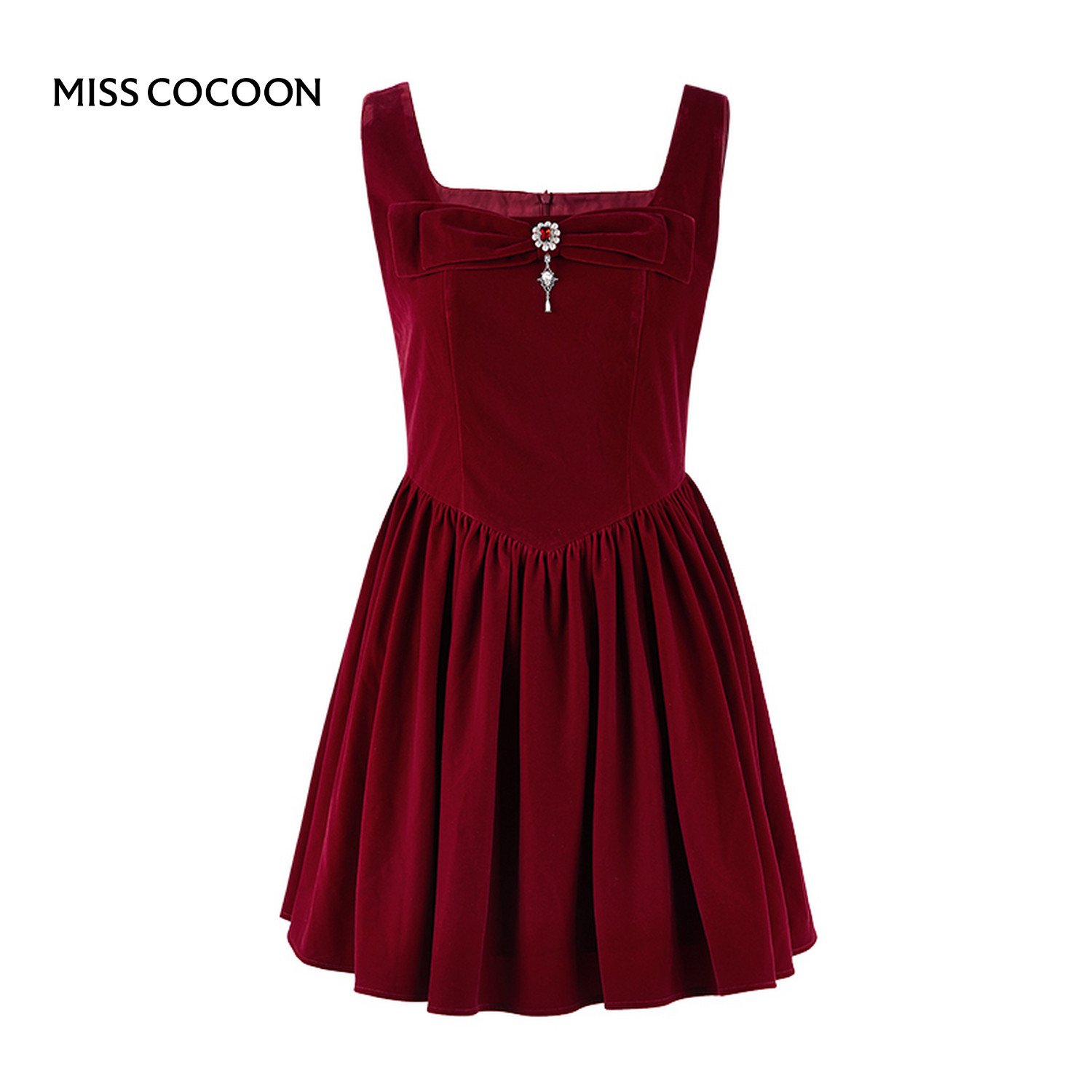 MISSCOCOON可可尼丝绒蝴蝶结小礼裙女2025秋冬新款红色吊带连衣裙