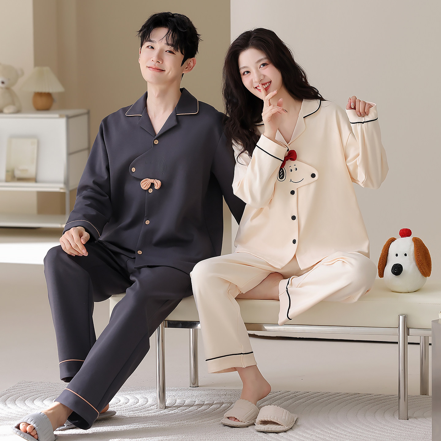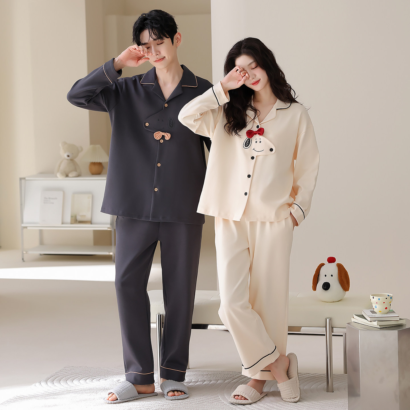 【超柔软】情侣睡衣春秋款纯棉长袖卡通可爱小狗男女舒适棉家居服