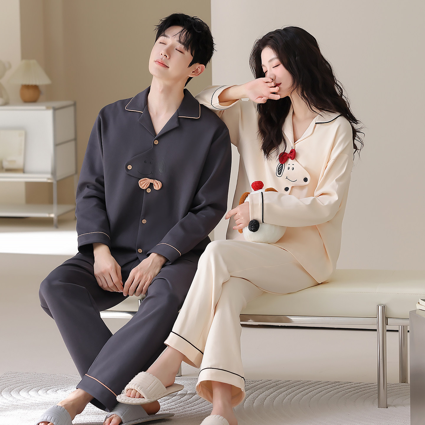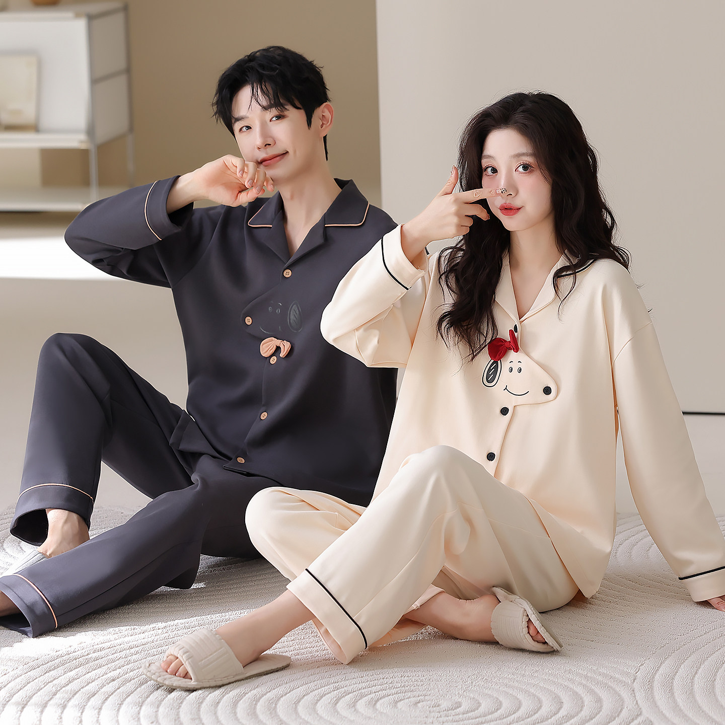 安比斯情侣睡衣舒适纯棉秋季女长袖男女同款休闲家居服套装可出门