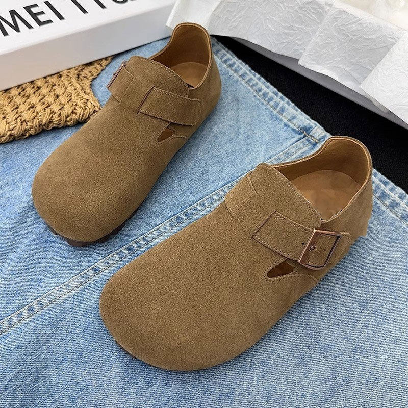 磨砂牛皮松糕厚底大头勃肯鞋女复古真皮圆头增高一脚蹬懒人毛毛鞋