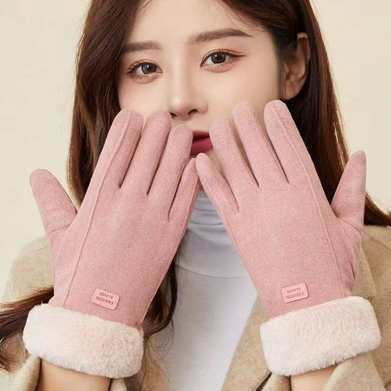 手套女生冬天高颜值手套冬天女加绒加厚保暖可爱麂皮绒女士骑行防