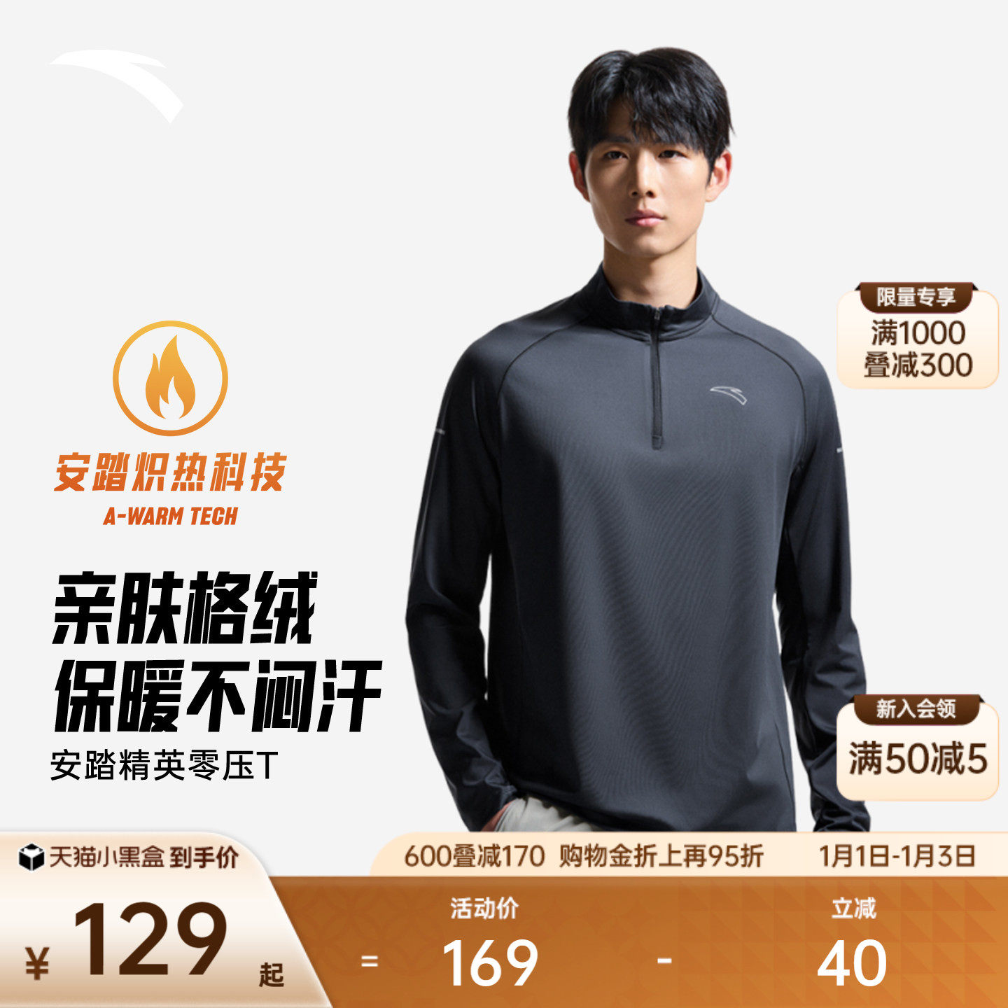 安踏零压T丨跑步加绒针织长袖上衣秋冬季男商务通勤速干半拉链T恤