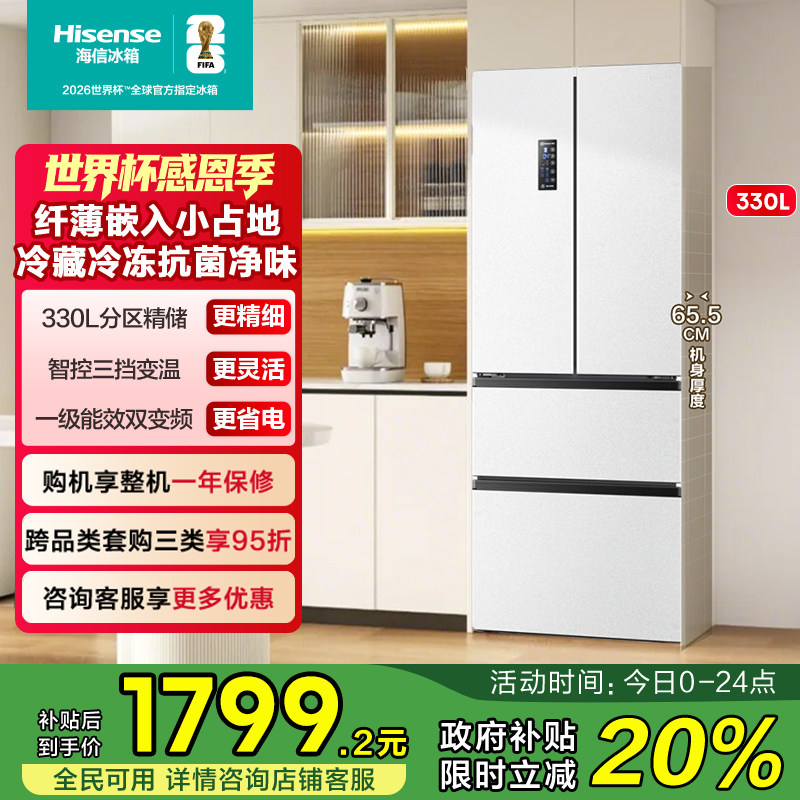 海信330L嵌入法式四门冰箱一级变频风冷无霜小型以旧换新补贴白色
