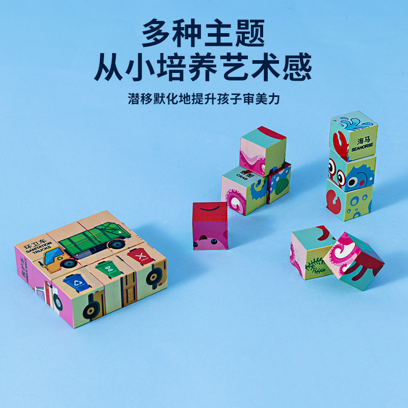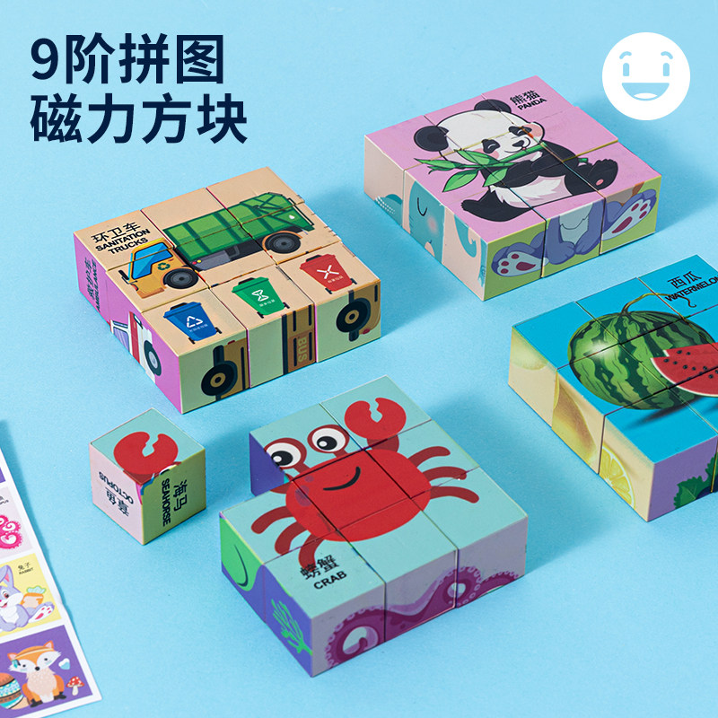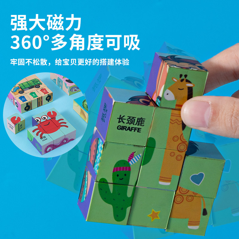 磁力方块拼图早教益智动物积木卡通六面画立体霸王龙拼图玩具塑胶