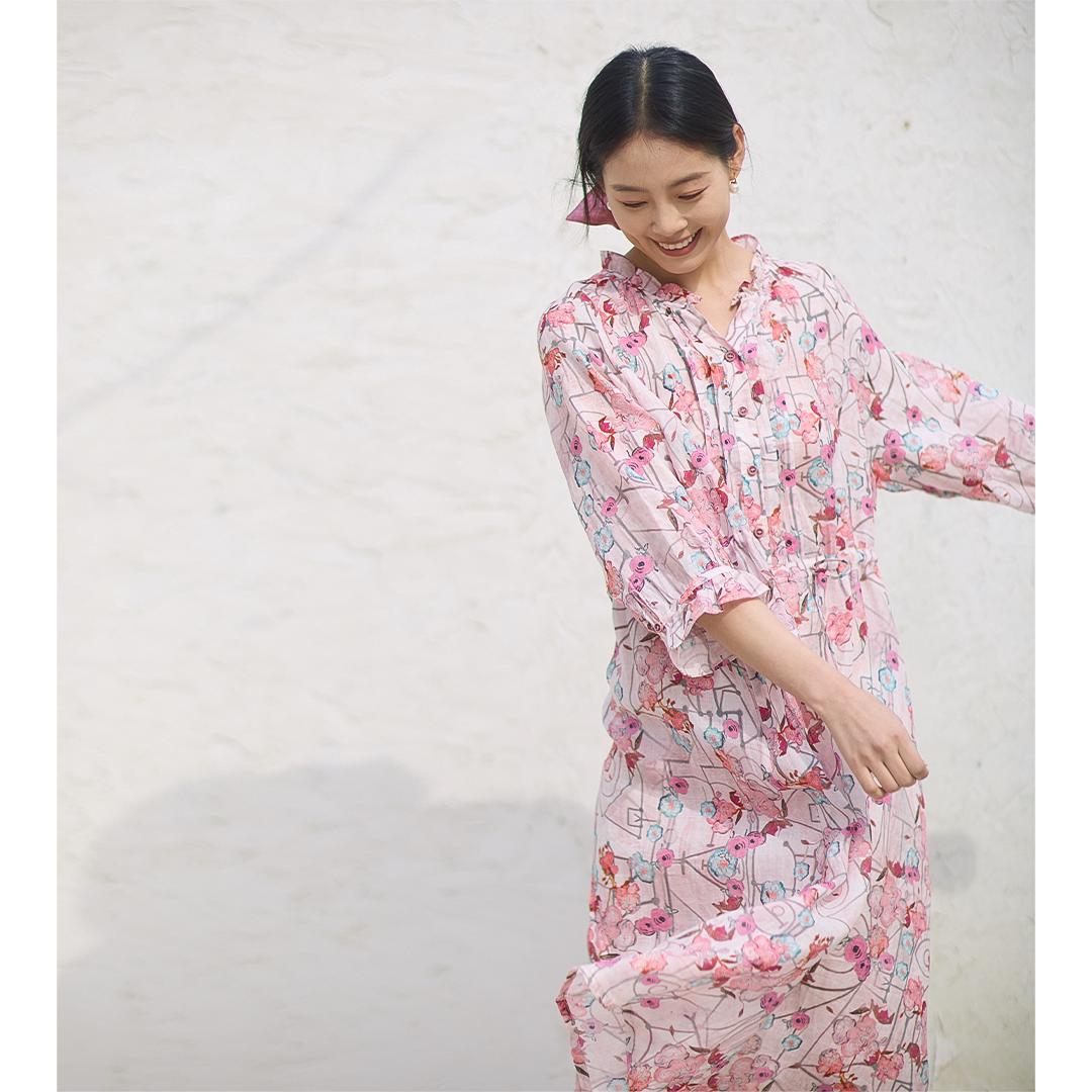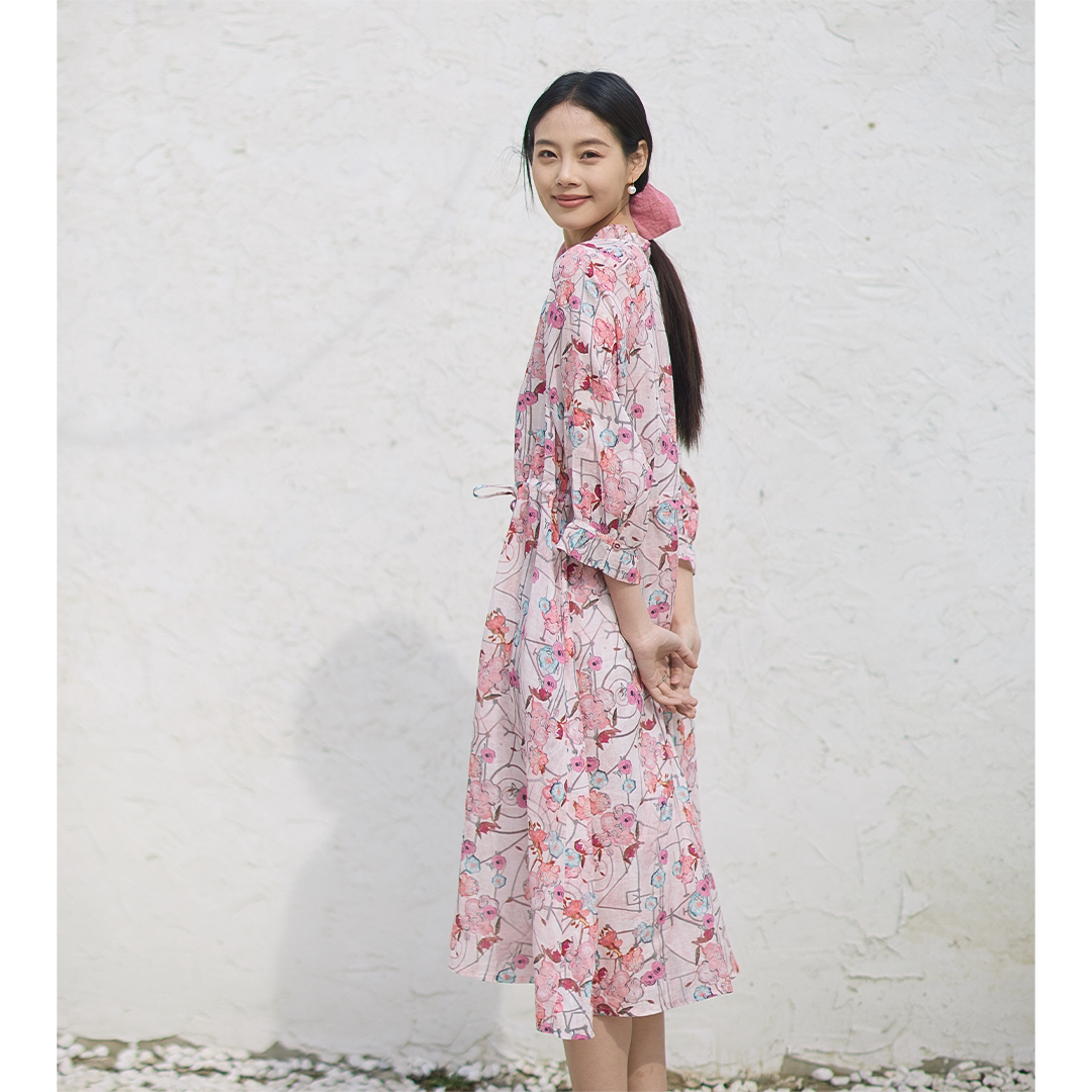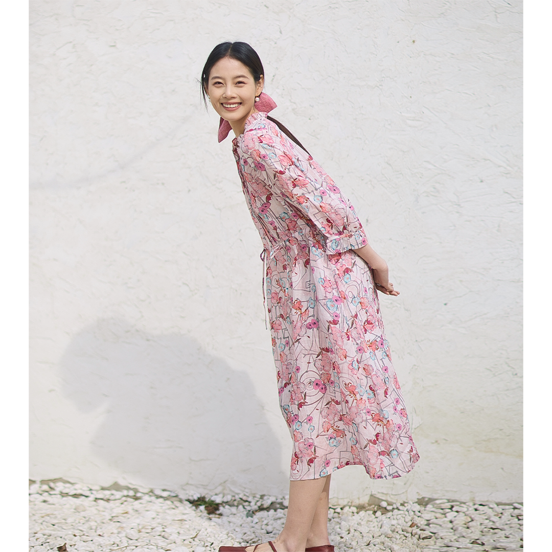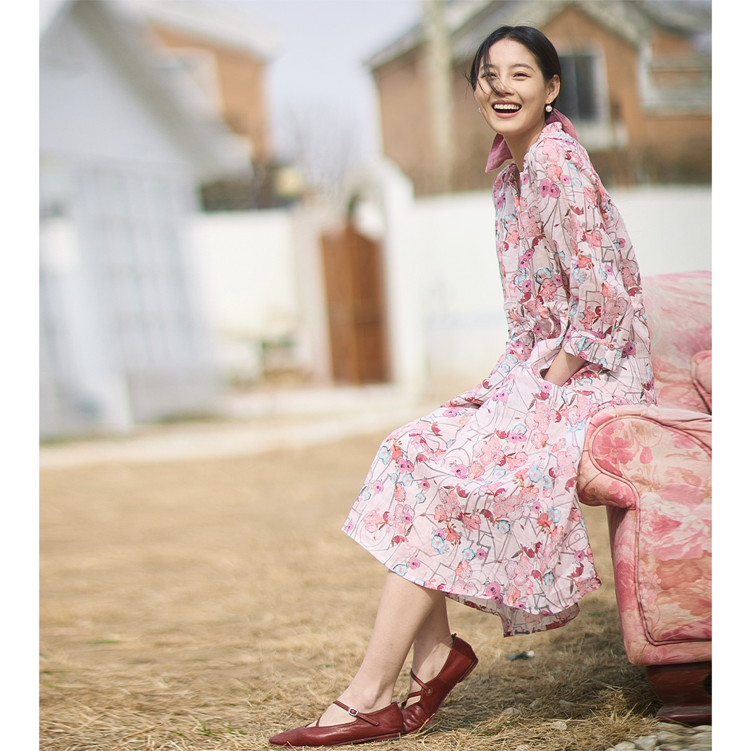 无色无味520浪漫蜜意虞美人苎麻印花田园休闲捏褶圆领系带连衣裙
