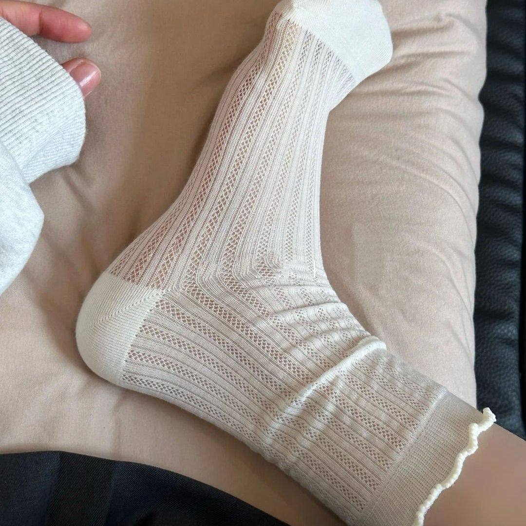 芭蕾风白色袜子女中筒袜夏季薄款纯色无骨网眼棉袜长袜夏天堆堆袜