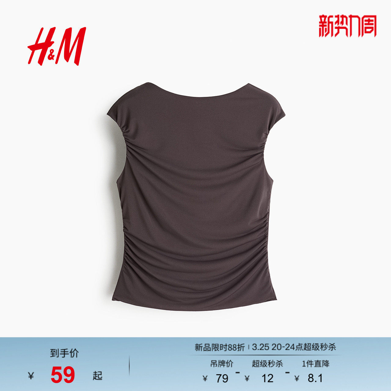 HM女装T恤春季垂坠盖袖款一字领褶皱修身上衣1300538