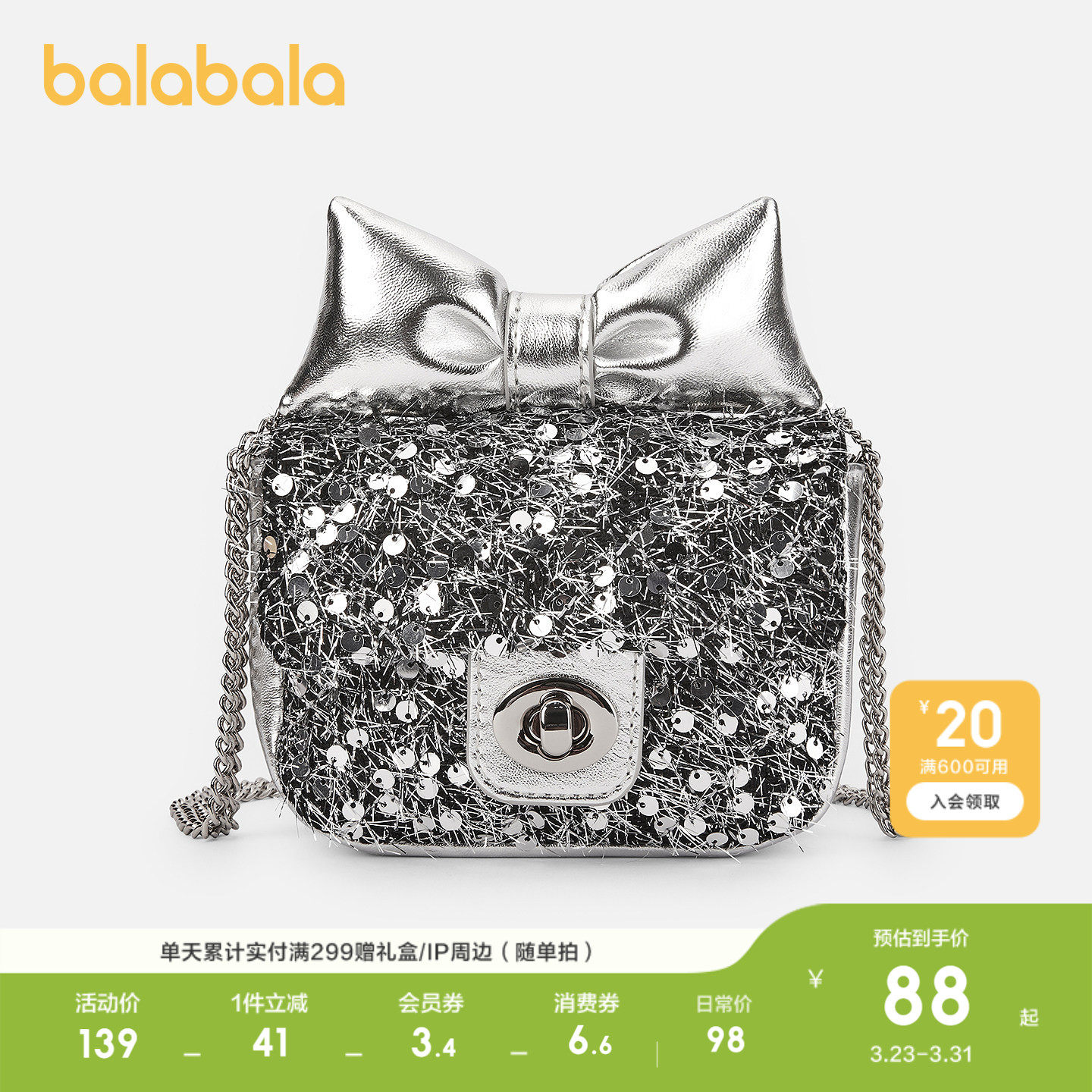 【商场同款】巴拉巴拉儿童休闲包女童蝴蝶结闪银斜跨背包时尚可爱