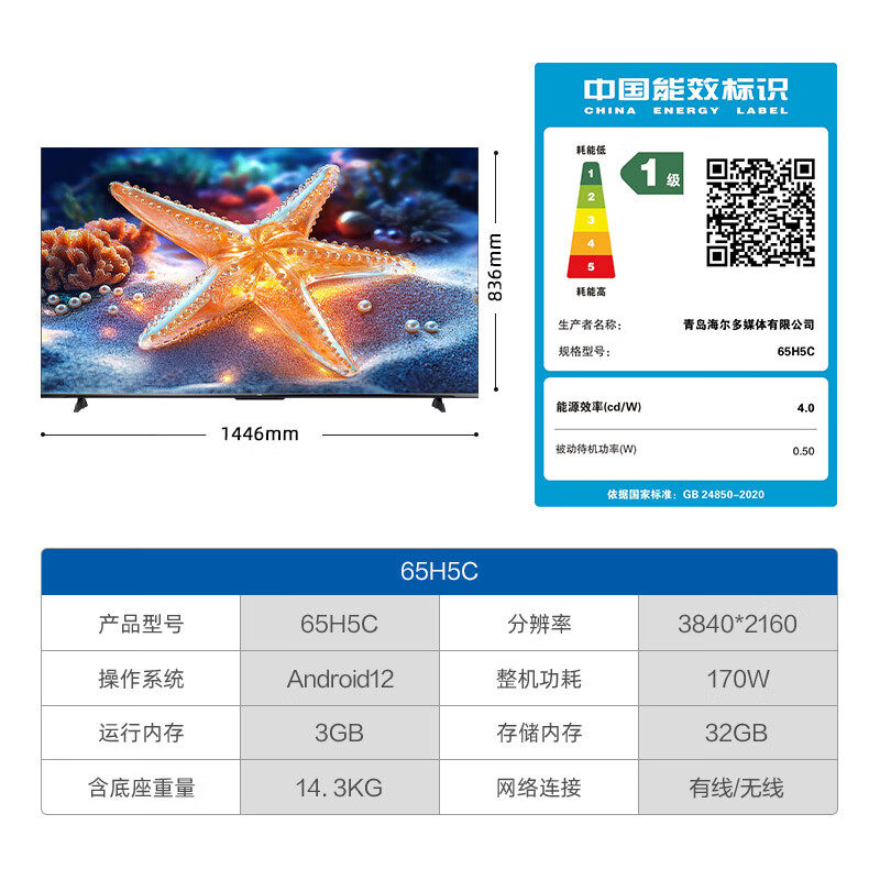海尔电视65英寸彩电4K超高清液晶家用平板电视机超薄65H5C旗舰店
