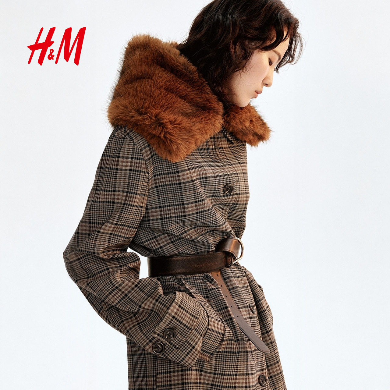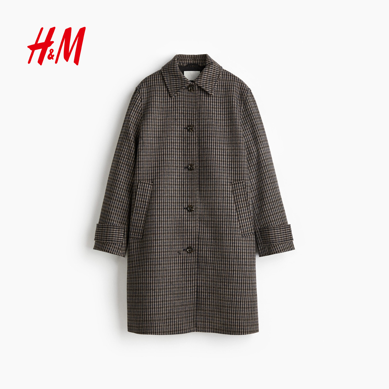 HM女装毛呢外套2025冬季新款气质上衣单排扣格子长款大衣1298554