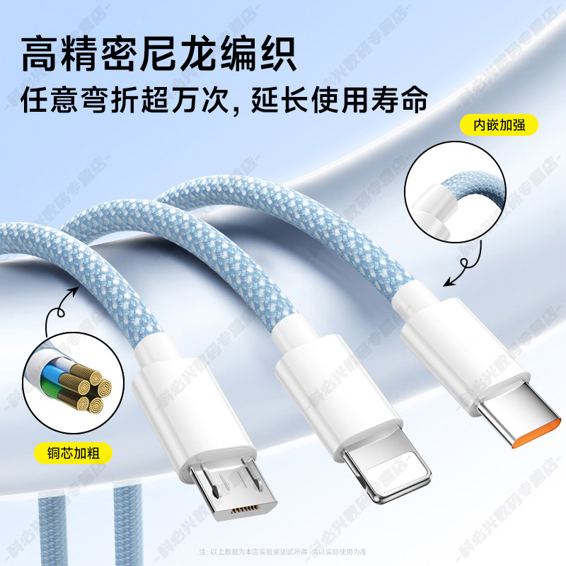 超级快充三合一数据线通用充电线适用苹果荣耀华为OPPO小米VIVO手机通用车载一拖三数据线透明芯片type-c带灯