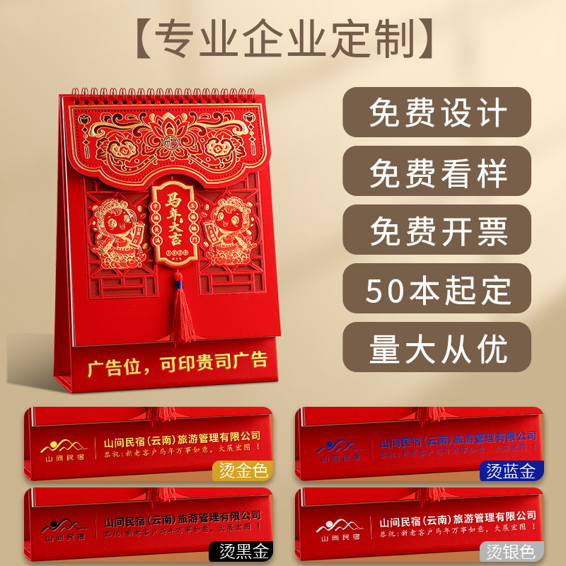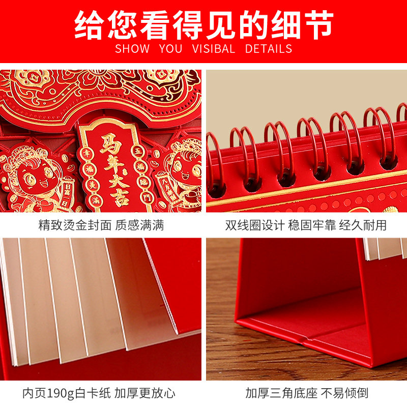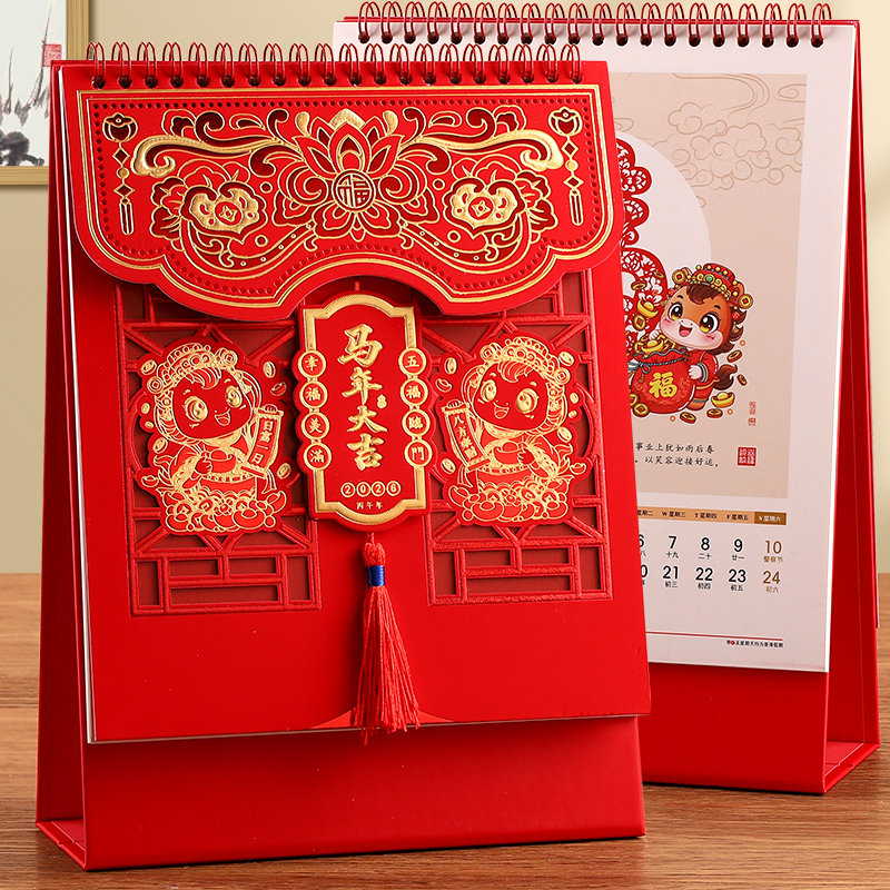 2026年新款十四张喜庆精雕艺术台历商务办公桌面打卡考研备忘录烫金封面翻页月历公司广告定制可印logo日历本