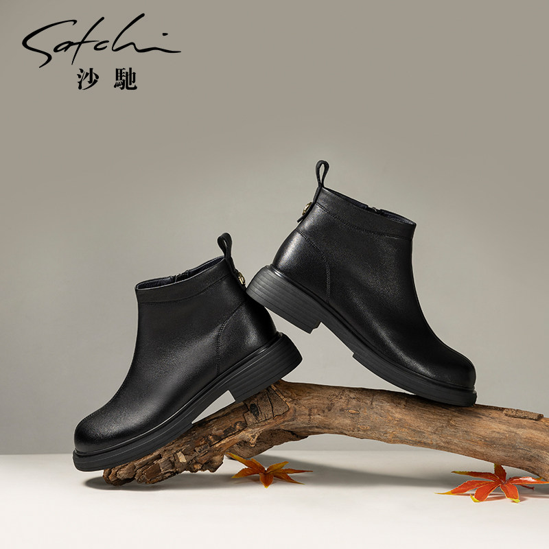 沙驰女鞋平跟羊皮革时装靴短靴2025年冬季新款通勤百搭短筒女靴子