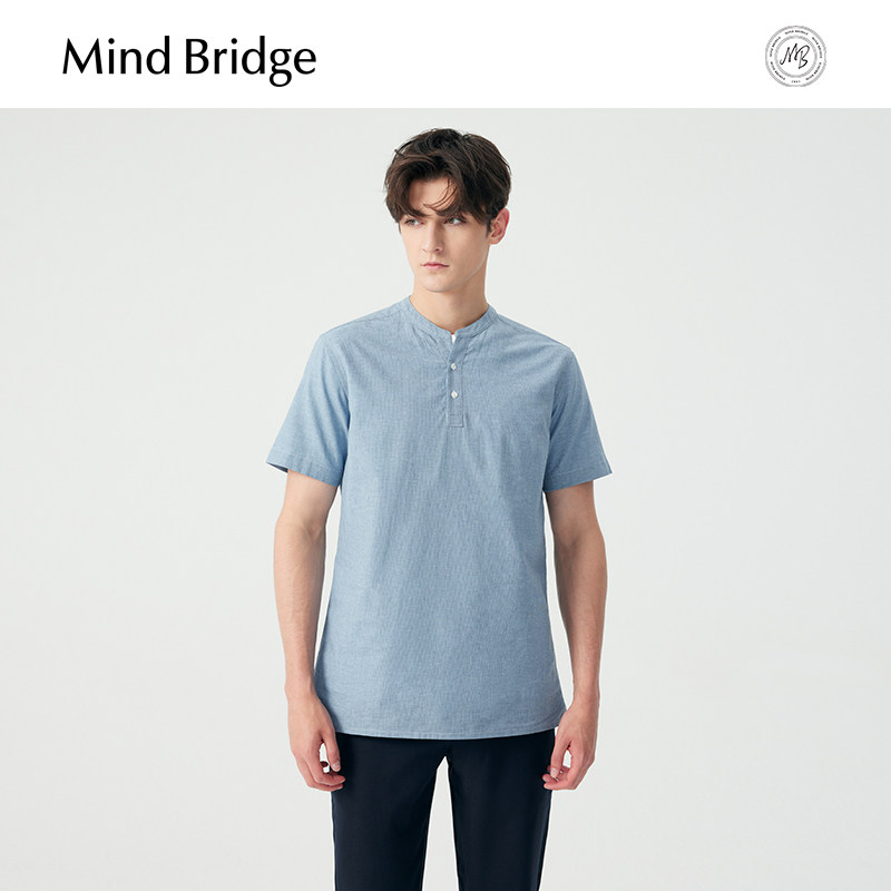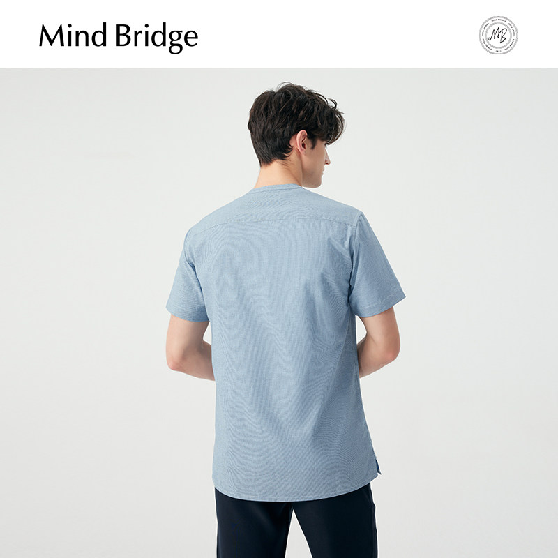 MB MindBridge夏季小立领短袖衬衫男士棉麻条纹衬衣简约通勤上衣