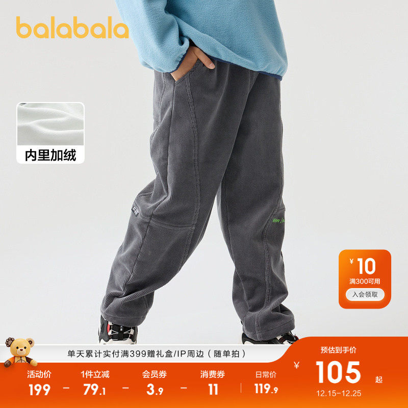 巴拉巴拉童装儿童裤子加绒男童中大童长裤秋冬灯芯绒保暖加厚直筒