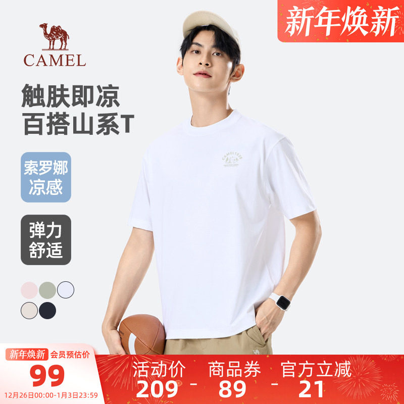 骆驼男装T恤男款运动夏季透气凉感纯色罗纹圆领半袖上衣时尚山系