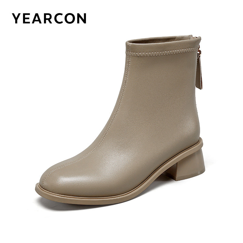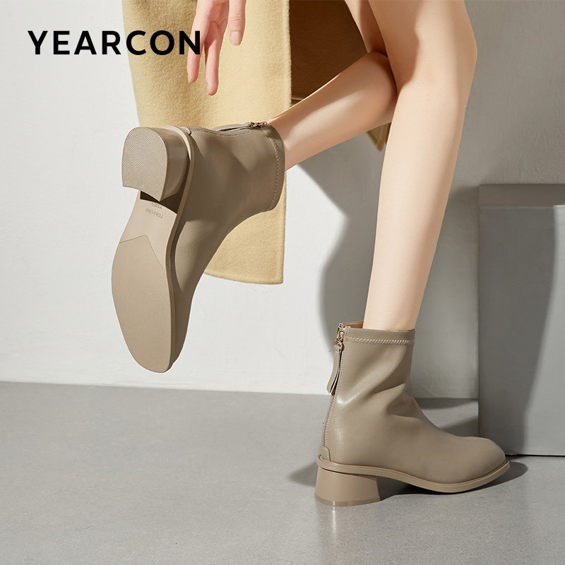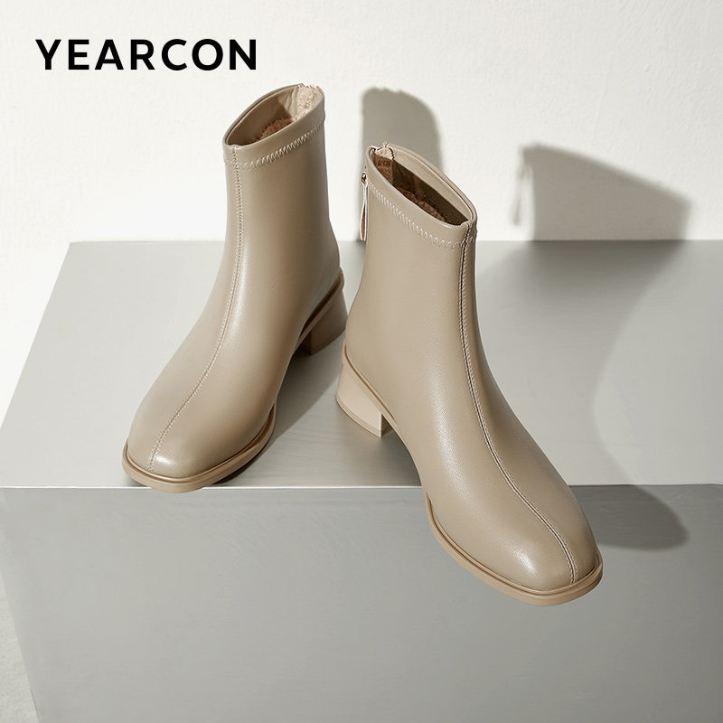 意尔康女鞋冬季法式加绒保暖棉鞋短靴真皮及踝靴气质粗跟妈妈皮鞋