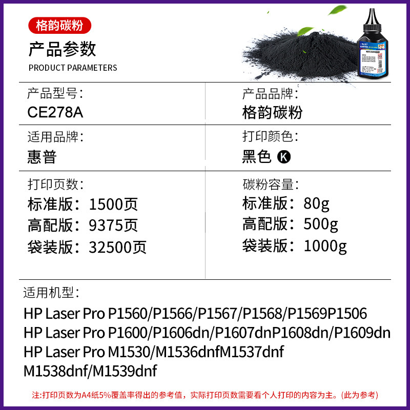 格韵适用hp78a ce278a碳粉hp1536dnf 1560 1566 1606佳能CRG328 mf4712 4700 4870 激光打印机硒鼓 墨粉