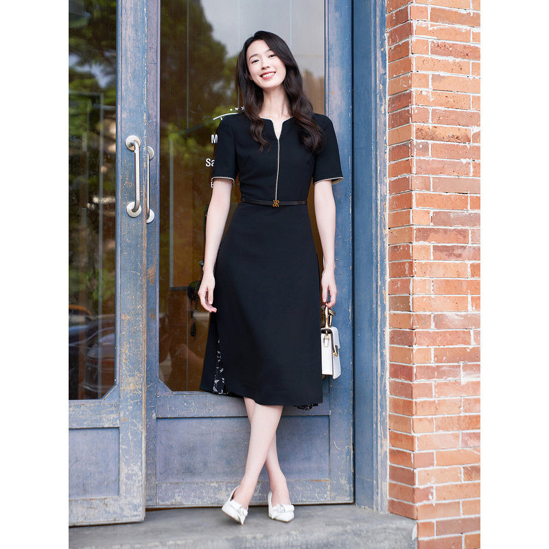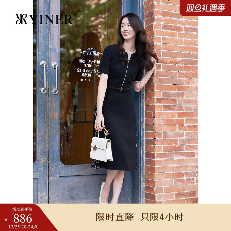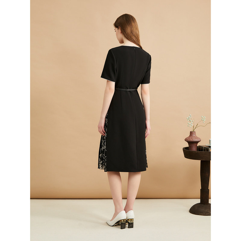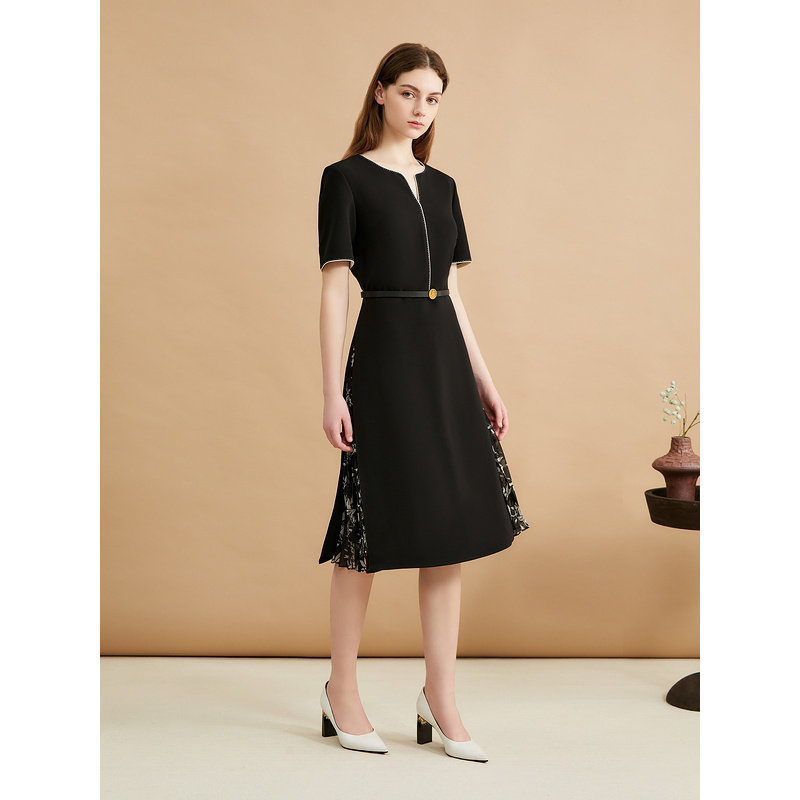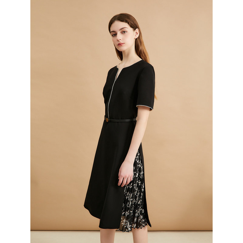 YINER音儿专选秋季女装法式玉兰花印花小黑裙拼收褶小蛮腰连衣裙