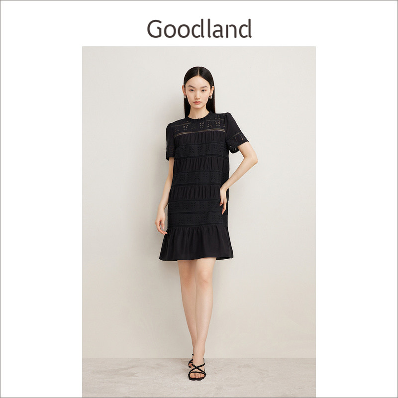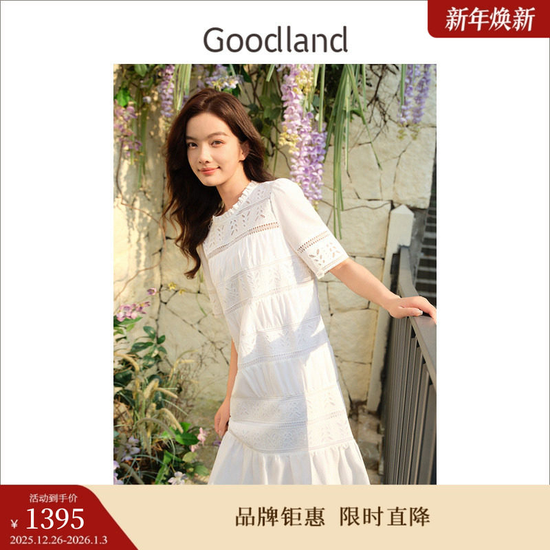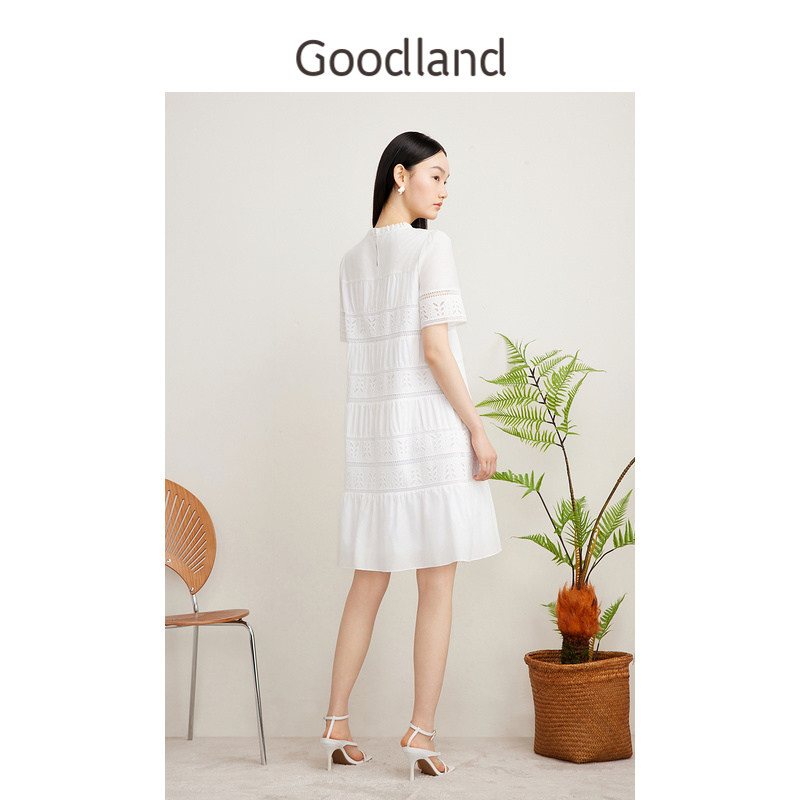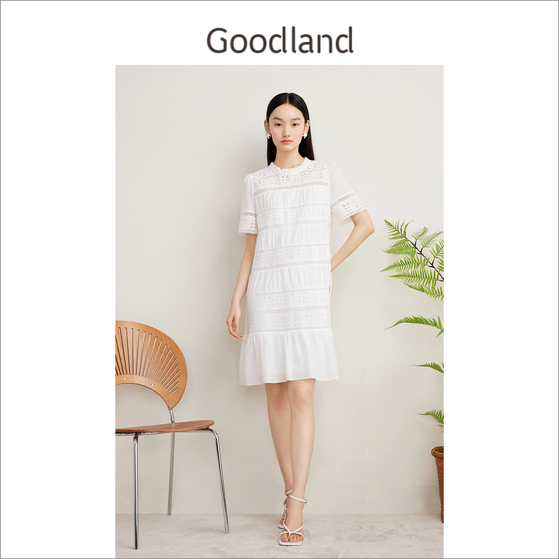 Goodland美地夏季艺术镂空蕾丝肌理荷叶花边白月光连衣裙