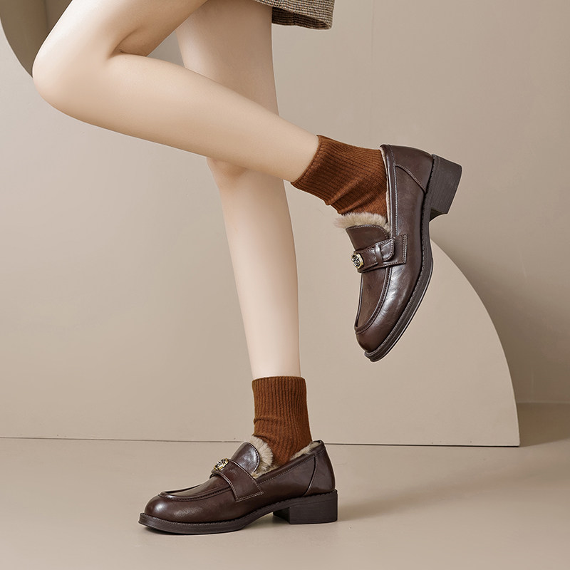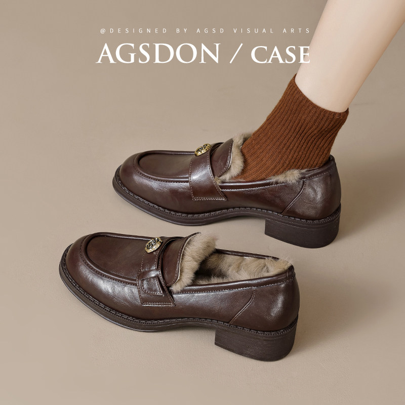 奥古狮登棕色加绒小皮鞋女一脚蹬2025冬季新款英伦加厚保暖乐福鞋