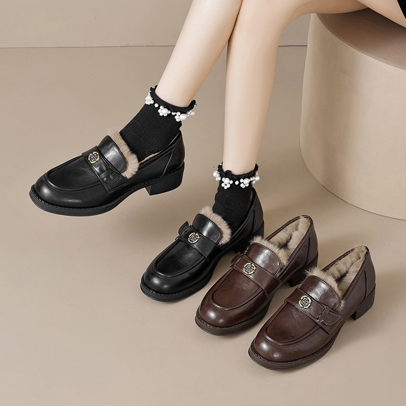羊皮~棕色山茶花乐福鞋女2025新款通勤粗跟单鞋百搭英伦风小皮鞋